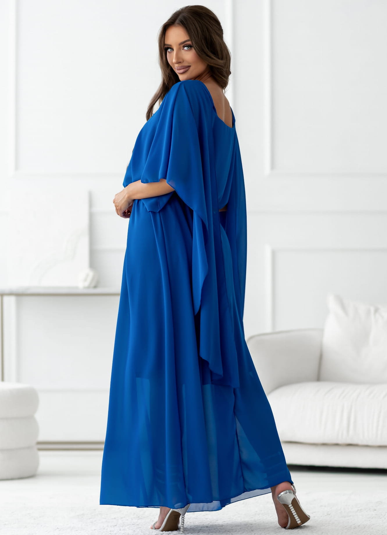 Zjawiskowa sukienka maxi to idealna propozycja na wyjątkowe okazje. Wykonana z lekkiej, zwiewnej tkaniny pięknie układa się w ruchu, zapewniając komfort i elegancki wygląd przez cały dzień.Model posiada luźną, opływającą sylwetkę z delikatnym odcięciem w talii, które subtelnie podkreśla figurę. Górna warstwa tworzy efekt miękko opadającej pelerynki z szerokimi, lejącymi rękawami, dodając stylizacji lekkości i szyku. Okrągły dekolt nadaje całości klasycznego charakteru.