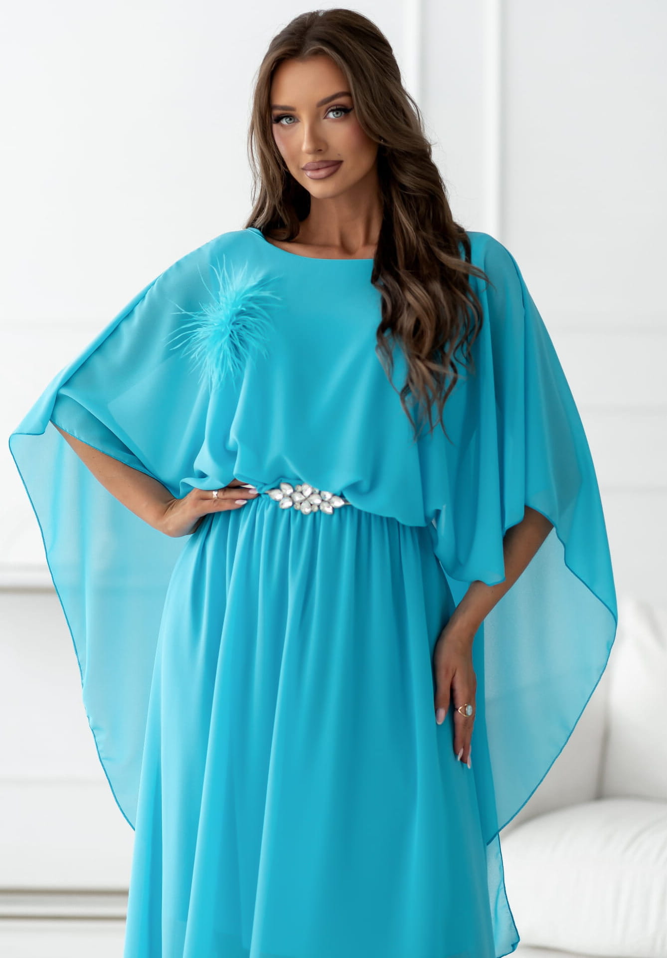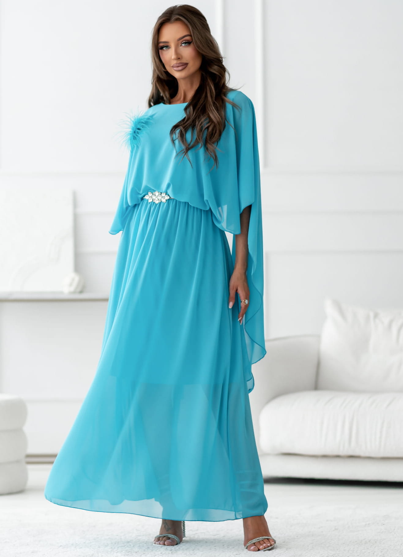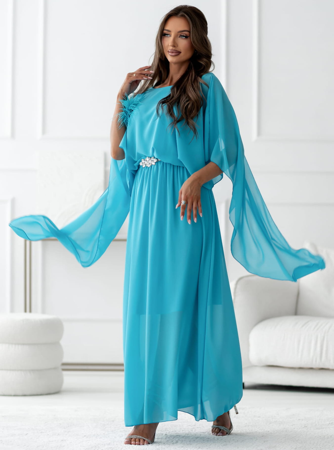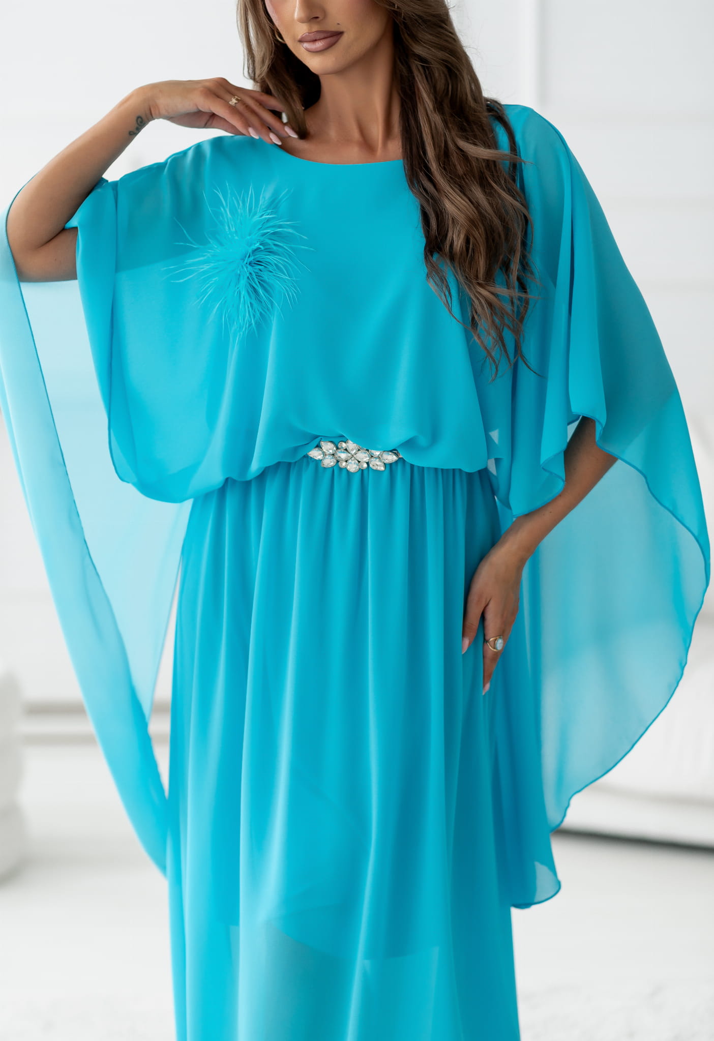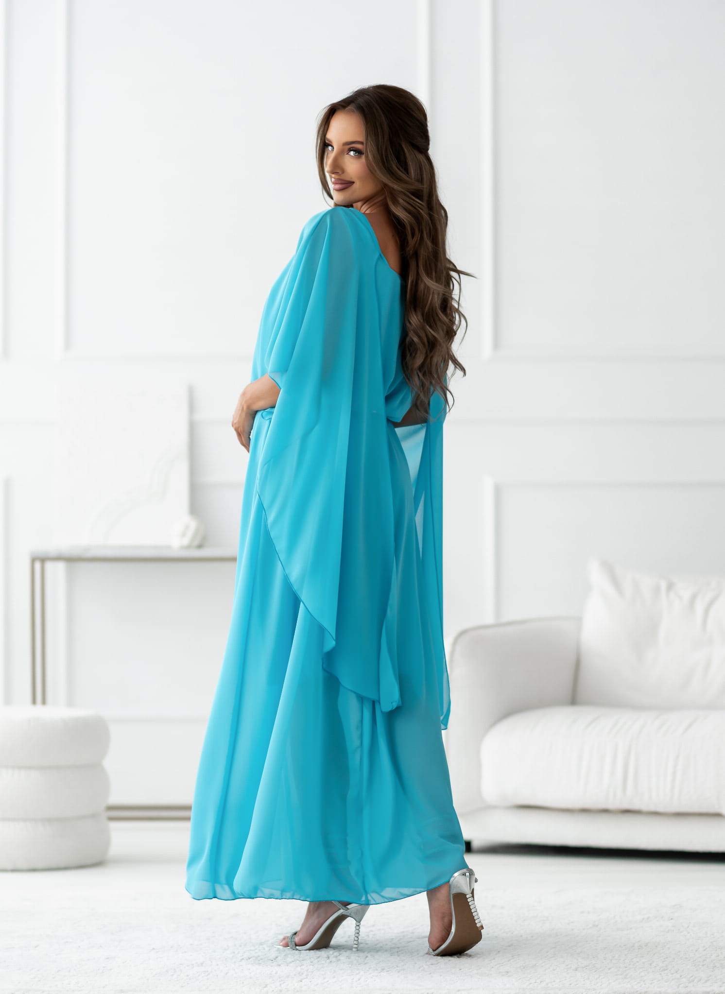 Zjawiskowa sukienka maxi to idealna propozycja na wyjątkowe okazje. Wykonana z lekkiej, zwiewnej tkaniny pięknie układa się w ruchu, zapewniając komfort i elegancki wygląd przez cały dzień.Model posiada luźną, opływającą sylwetkę z delikatnym odcięciem w talii, które subtelnie podkreśla figurę. Górna warstwa tworzy efekt miękko opadającej pelerynki z szerokimi, lejącymi rękawami, dodając stylizacji lekkości i szyku. Okrągły dekolt nadaje całości klasycznego charakteru.