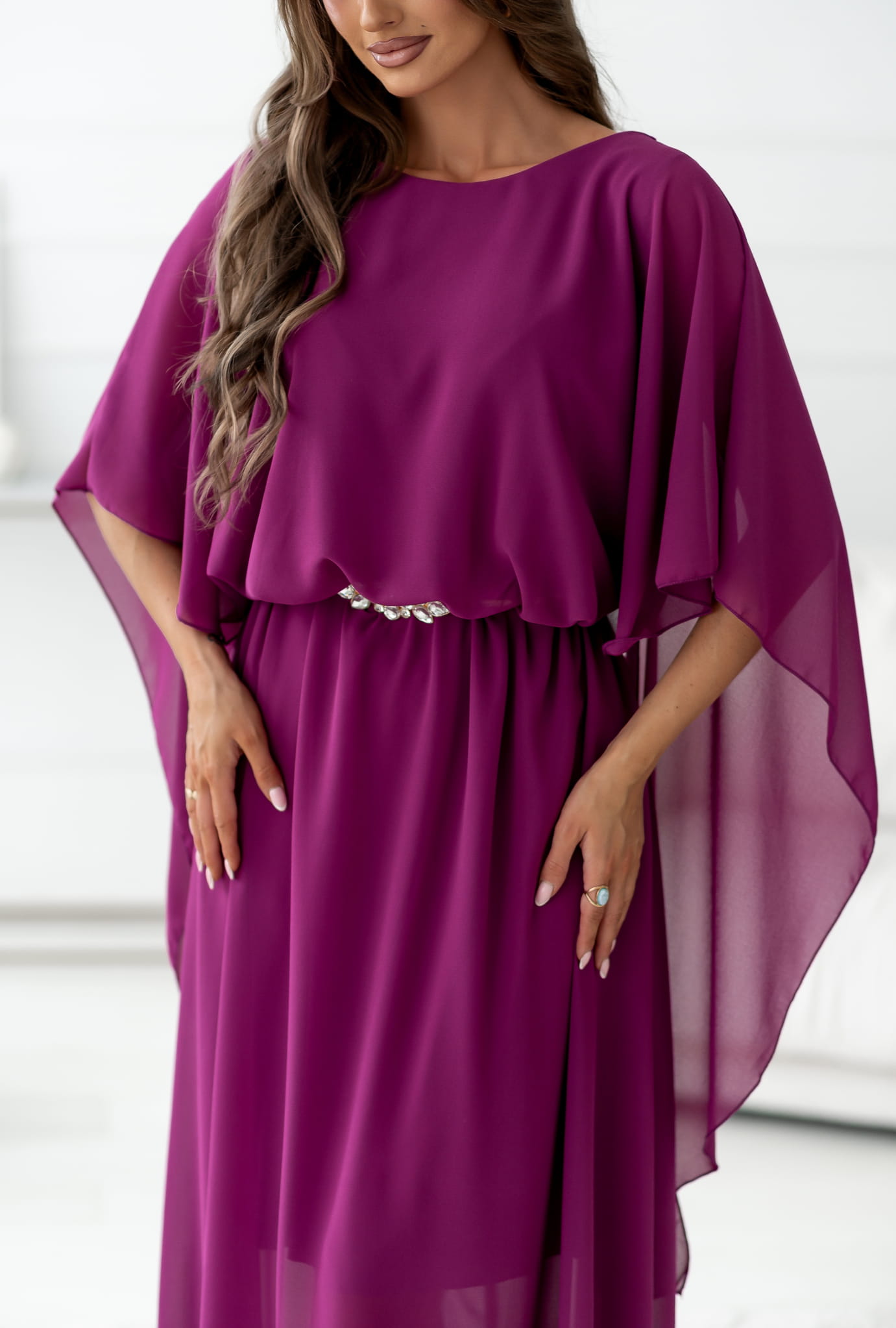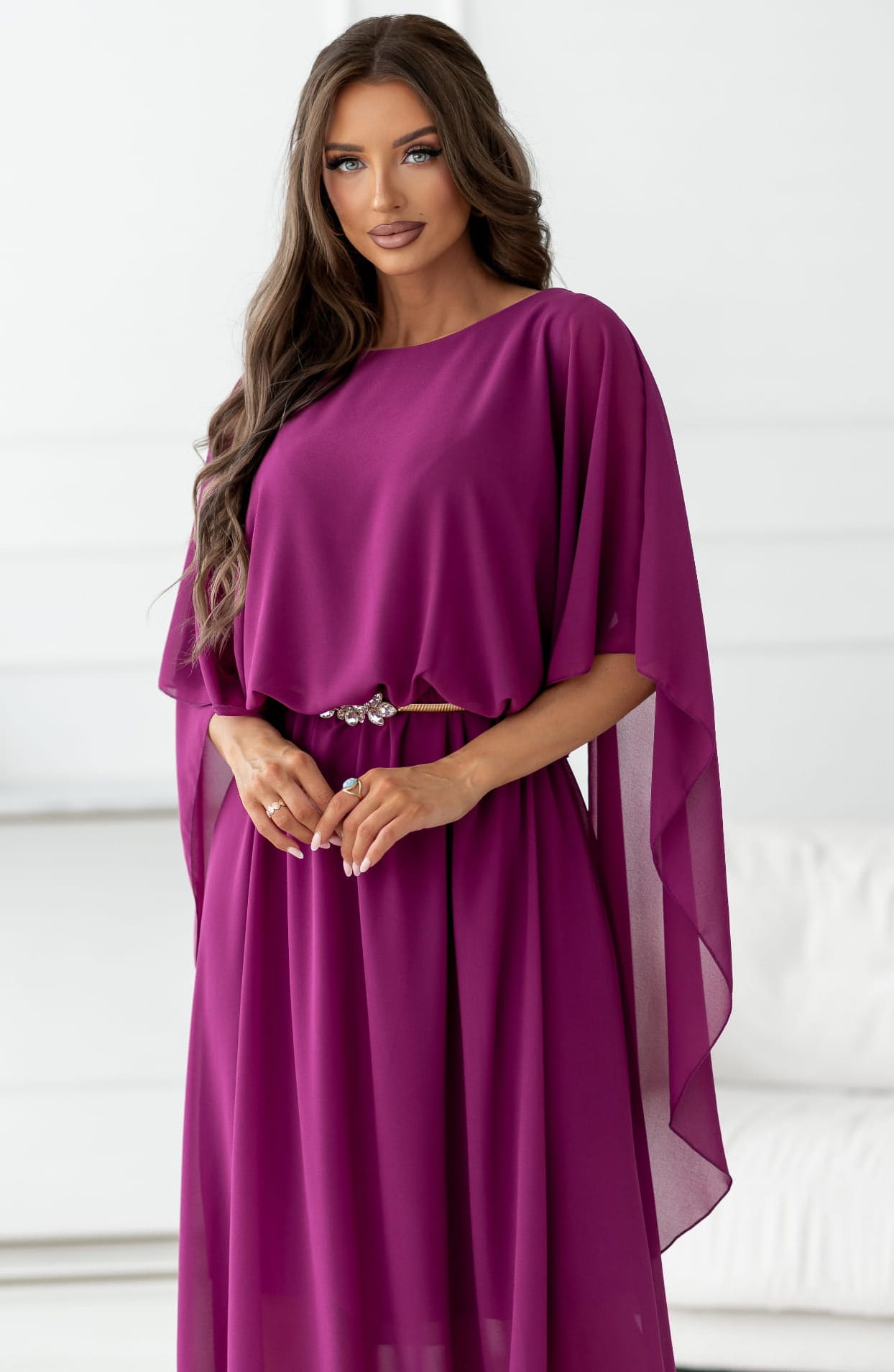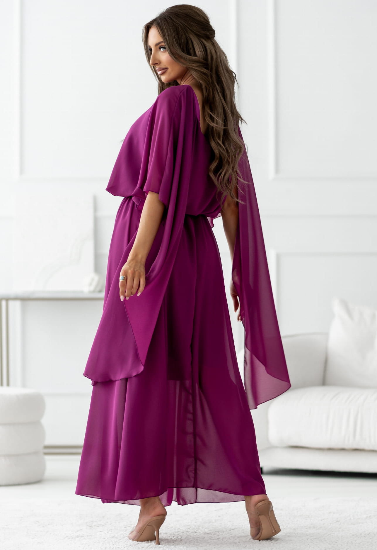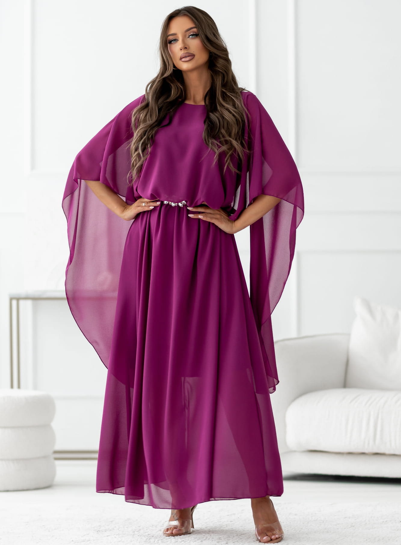 Zjawiskowa sukienka maxi to idealna propozycja na wyjątkowe okazje. Wykonana z lekkiej, zwiewnej tkaniny pięknie układa się w ruchu, zapewniając komfort i elegancki wygląd przez cały dzień.Model posiada luźną, opływającą sylwetkę z delikatnym odcięciem w talii, które subtelnie podkreśla figurę. Górna warstwa tworzy efekt miękko opadającej pelerynki z szerokimi, lejącymi rękawami, dodając stylizacji lekkości i szyku. Okrągły dekolt nadaje całości klasycznego charakteru.