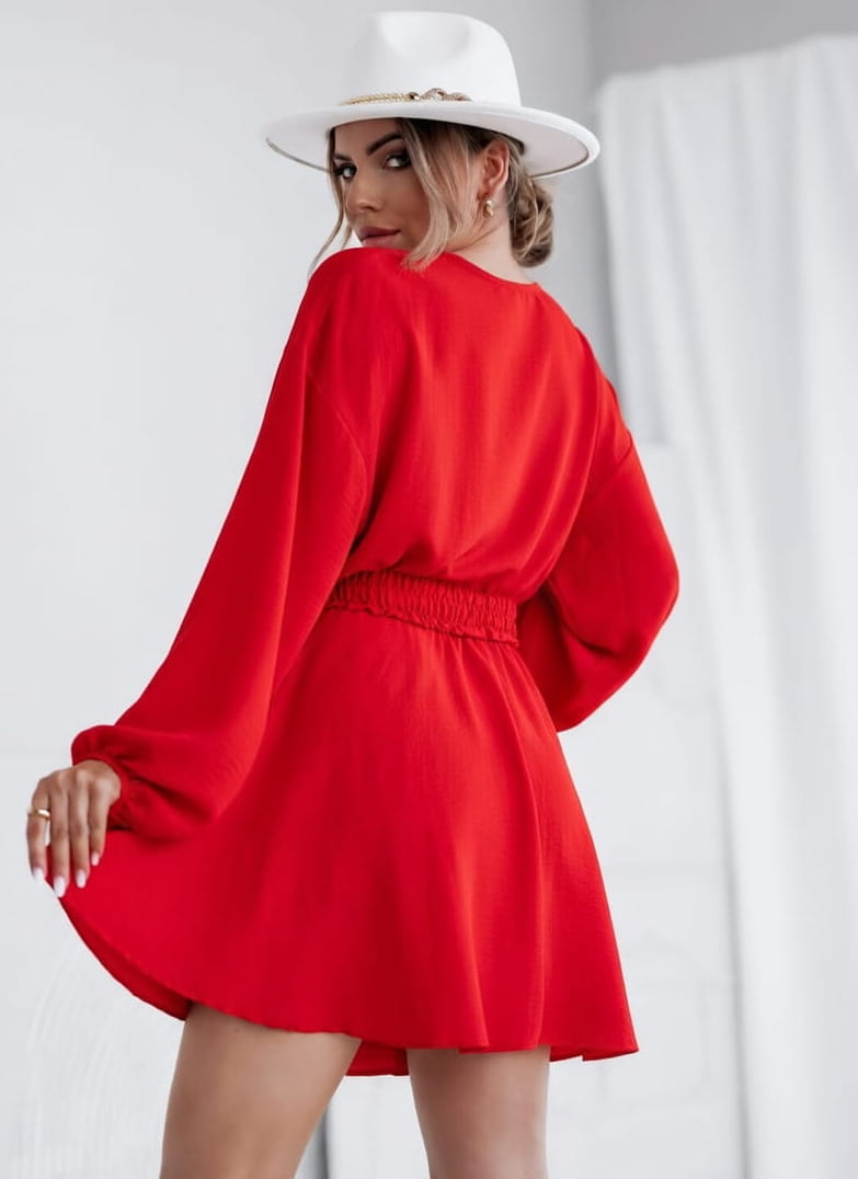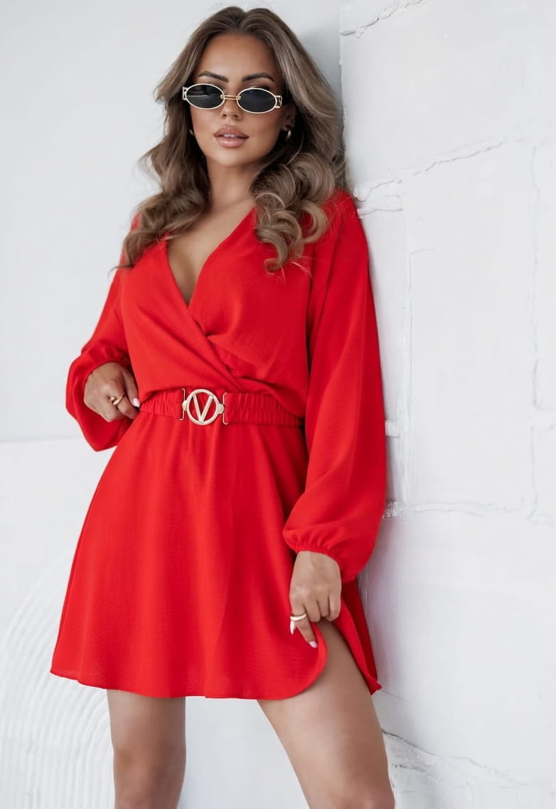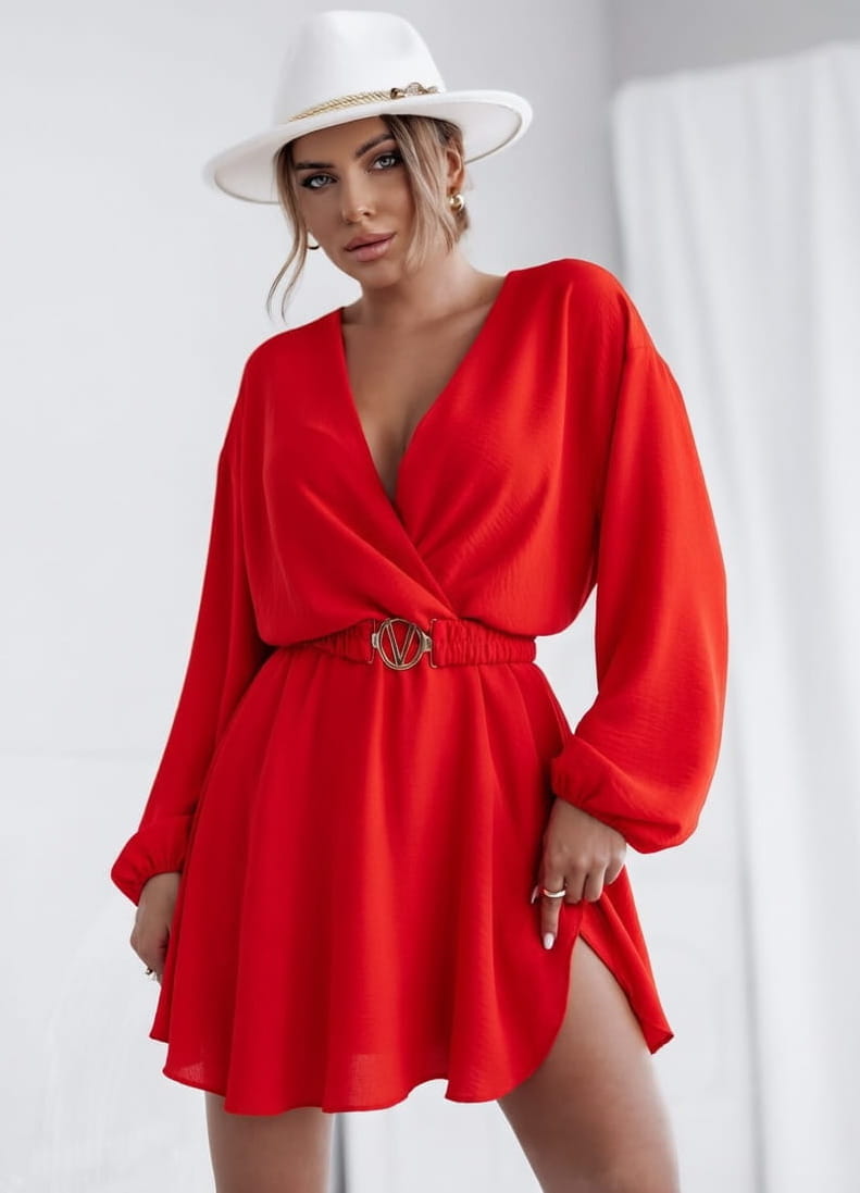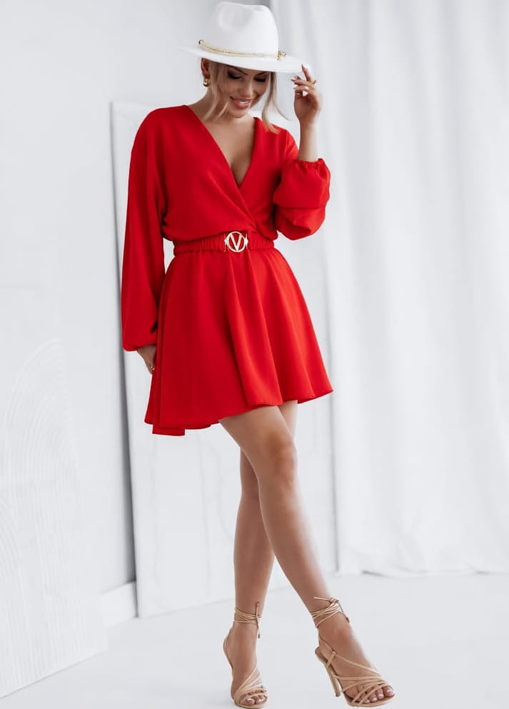 Włoski kombinezon imitujący na zewnątrz sukienkę, pod spodem wszyte spodenki. W pasie kombinezonu gumka. W komplecie pasek ze złotą sprzączką.