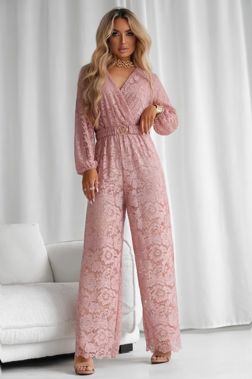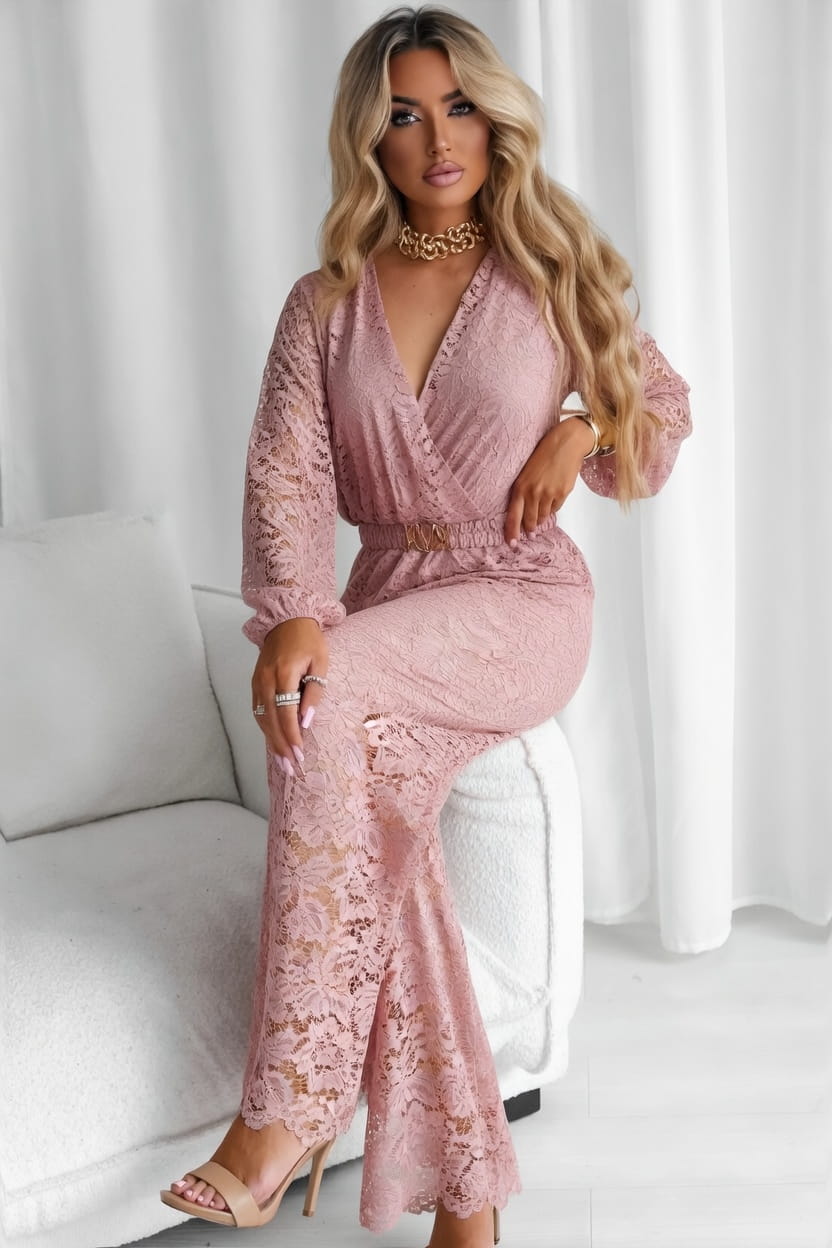 Kombinezon koronkowy V długi rękaw plus pasek pudrowy róż
