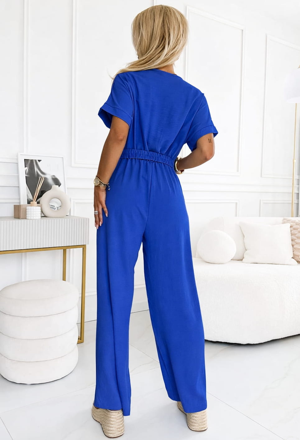 Włoski kombinezon o eleganckim i klasycznym kroju, w pasie gumka i pasek w komplecie ze złotą sprzączką.