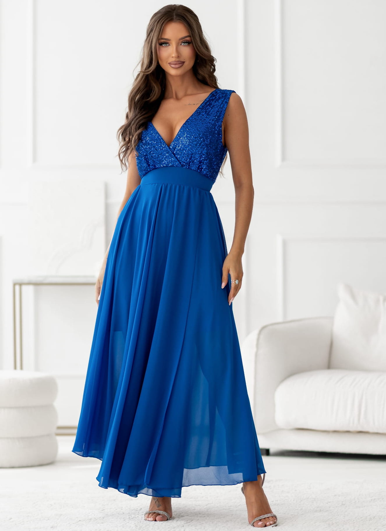 Góra Sukienki: Elegancki dekolt w kształcie litery V, obszyty błyszczącymi cekinami, które pięknie mienią się w świetle, dodając kreacji spektakularnego blasku. Fason góry bez rękawów, z cienkimi ramiączkami, subtelnie eksponuje ramiona i obojczyki.