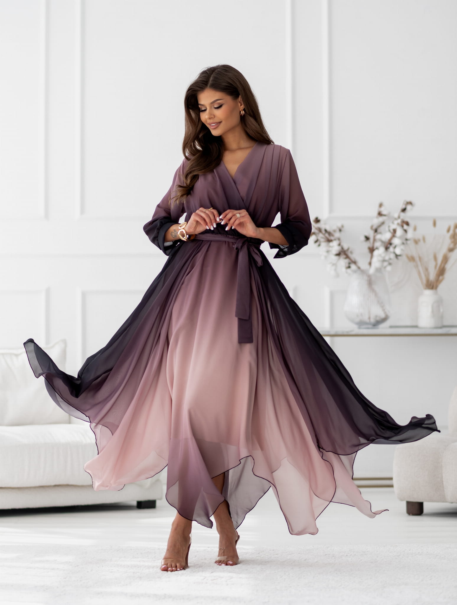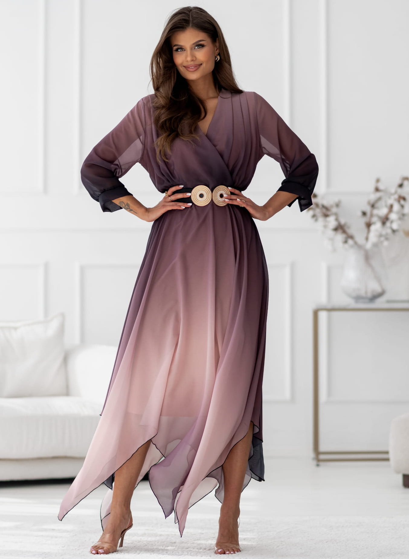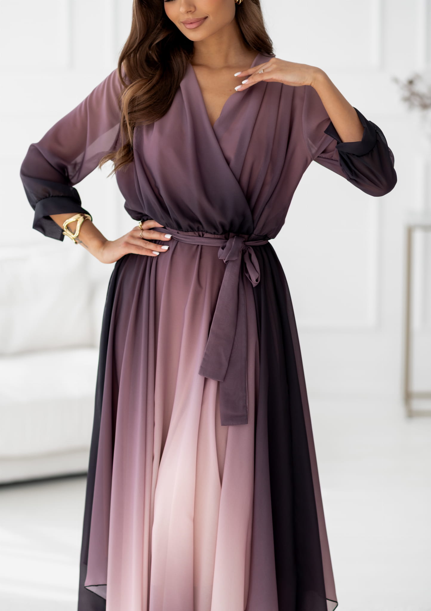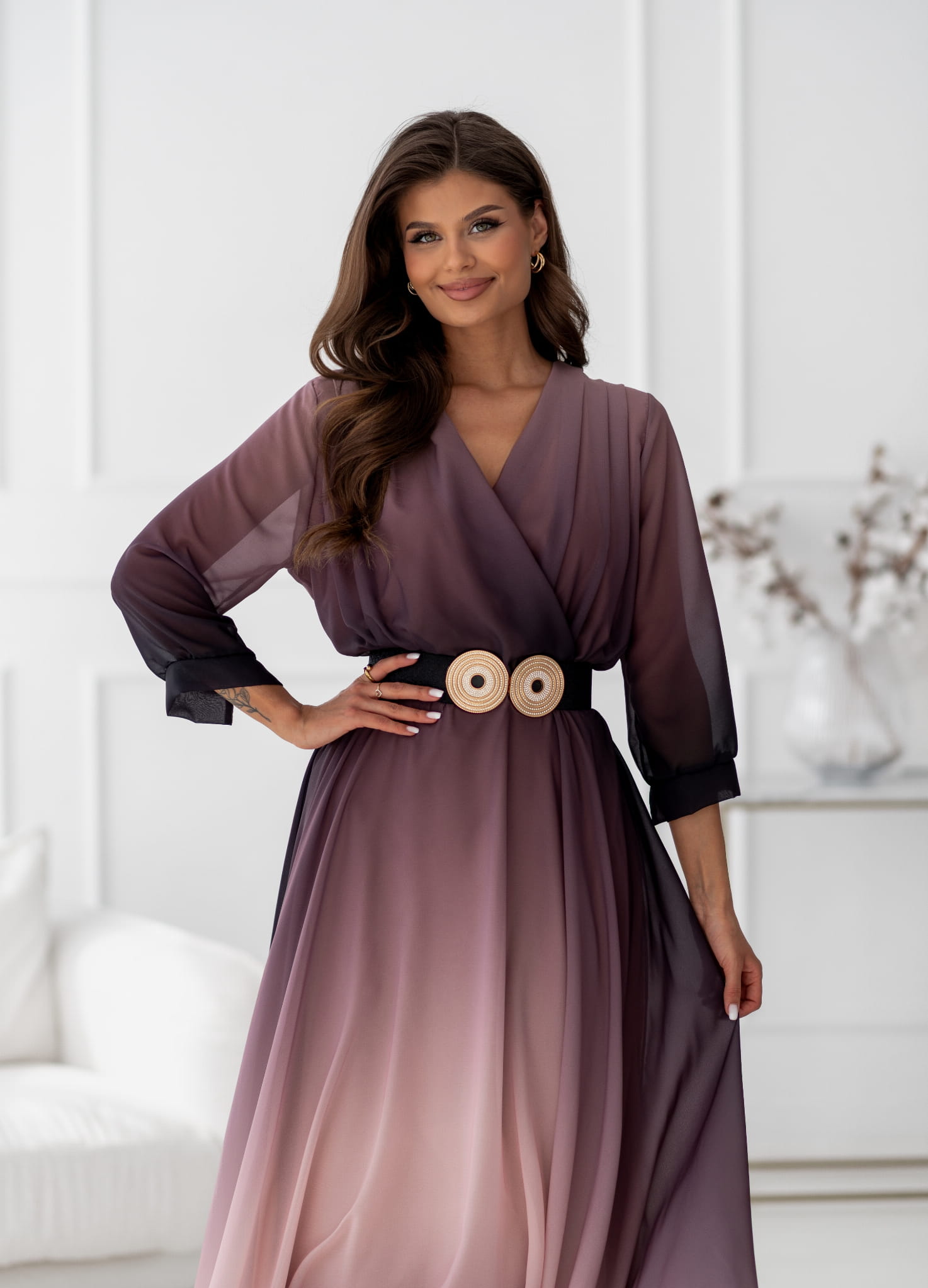 Kopertowa sukienka z wysokiej jakości szyfonu. Sukienka cała na podszewce, w pasie gumka, rękaw 3/4. Sukienka sprzedawana z paskiem materiałowym w kolorze sukienki. Pasek na czarnej gumie, widoczny na zdjęciach, można dokupić na naszej stronie w dziale Galanteria i biżuteria