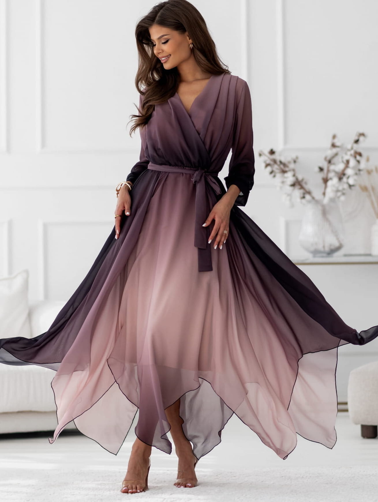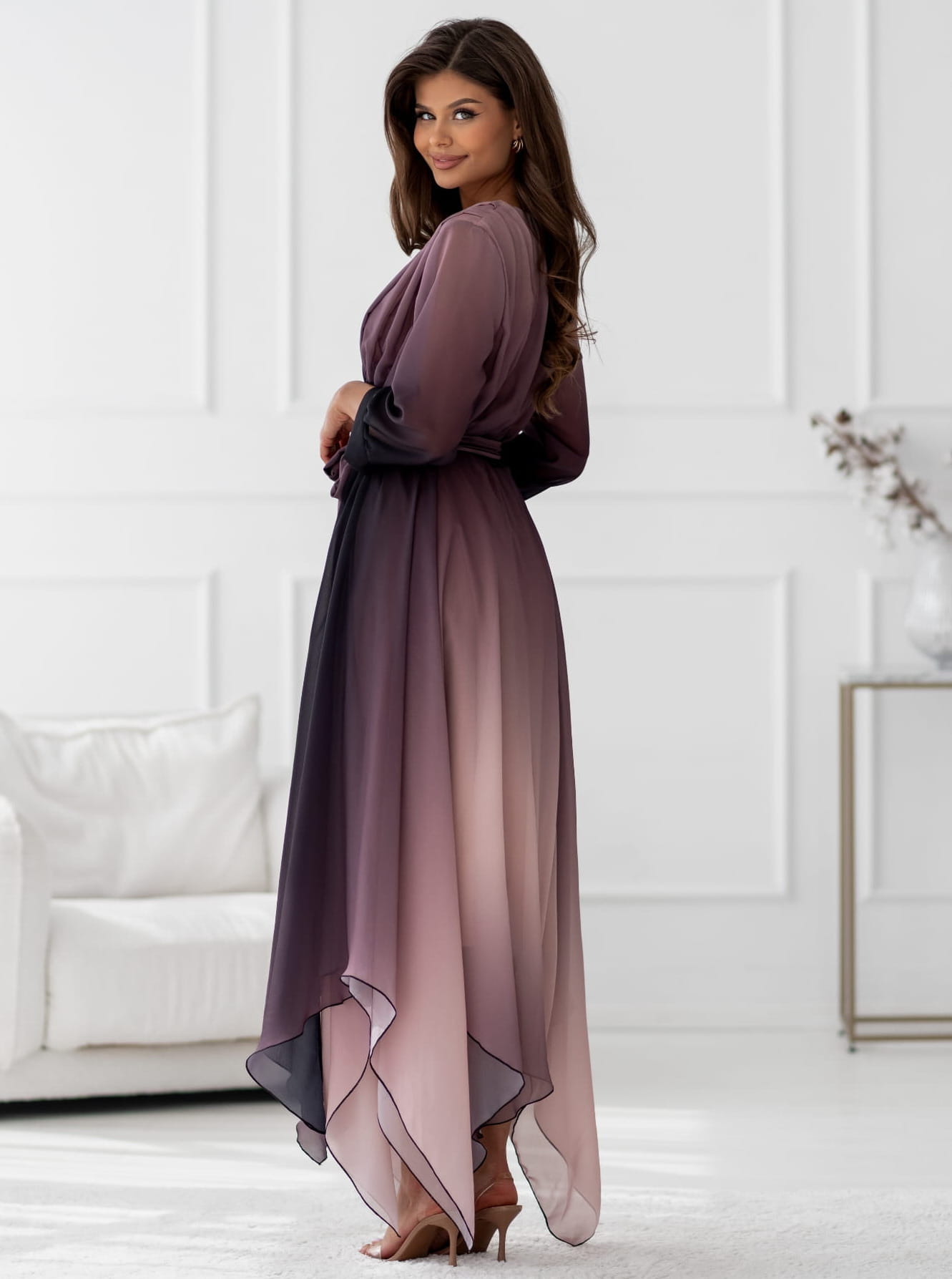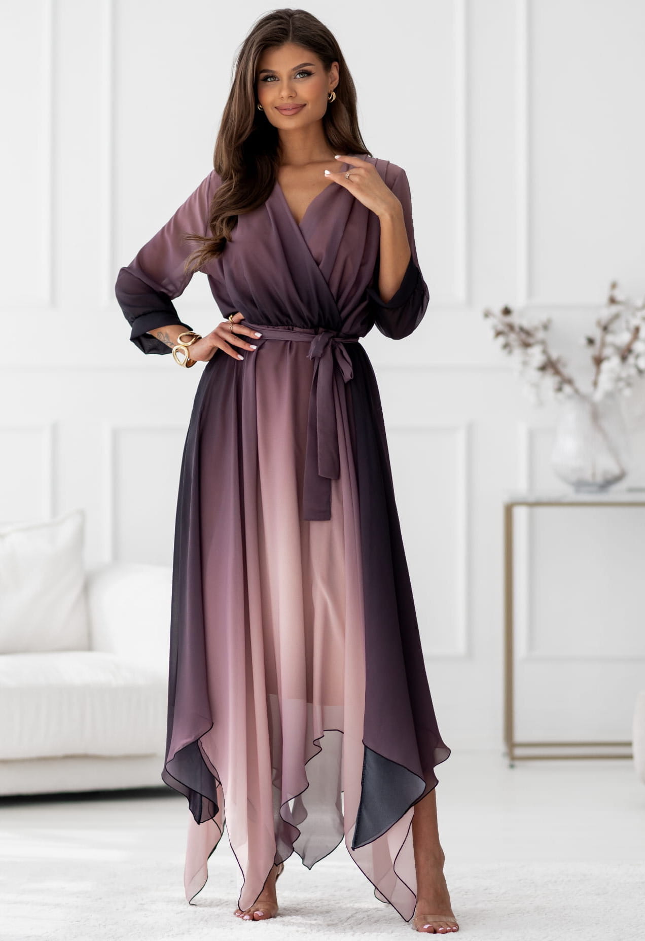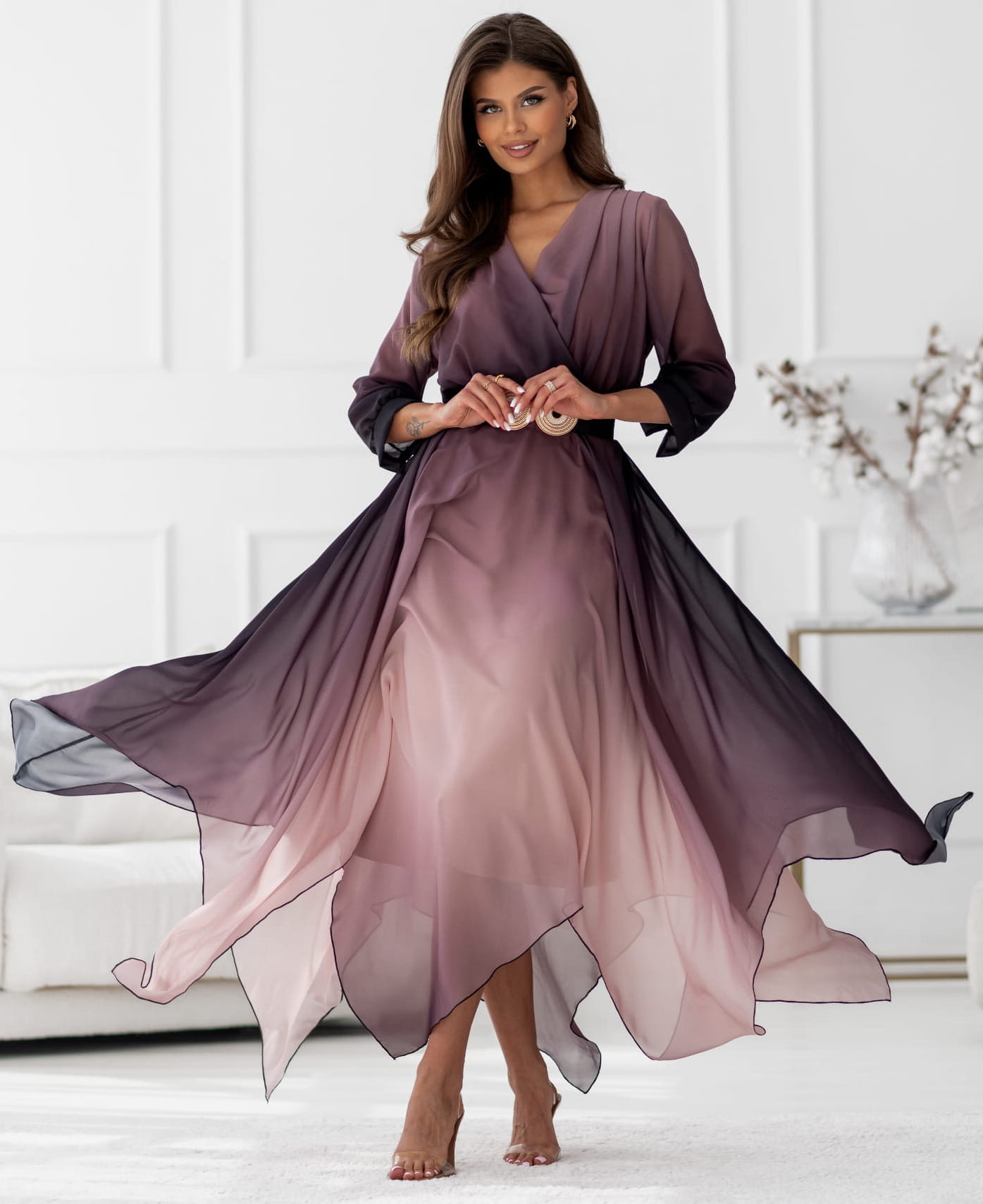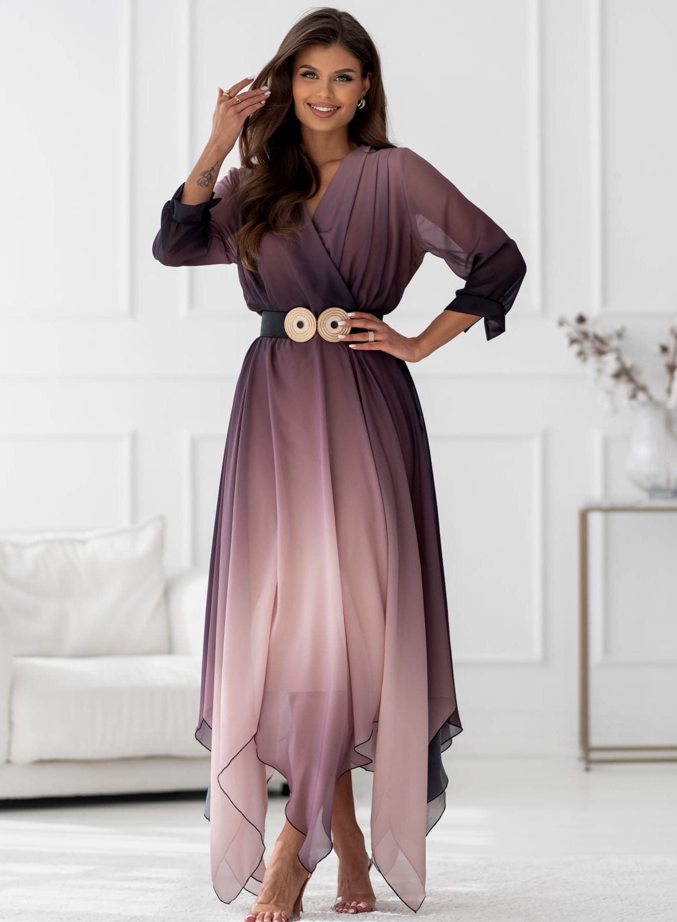 Kopertowa sukienka z wysokiej jakości szyfonu. Sukienka cała na podszewce, w pasie gumka, rękaw 3/4. Sukienka sprzedawana z paskiem materiałowym w kolorze sukienki. Pasek na czarnej gumie, widoczny na zdjęciach, można dokupić na naszej stronie w dziale Galanteria i biżuteria