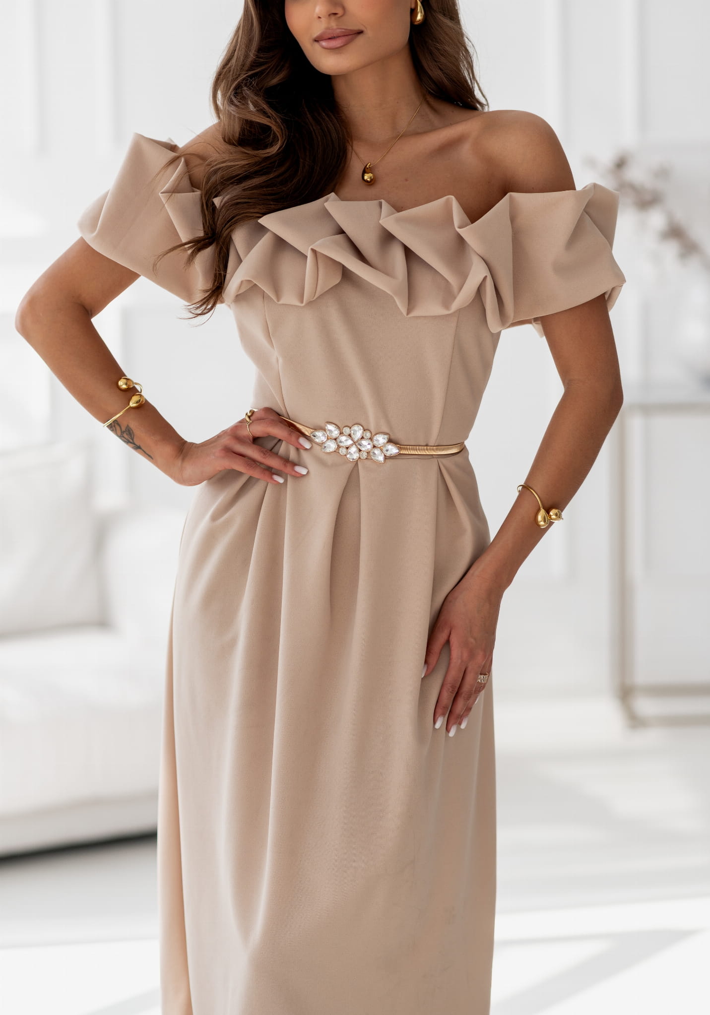 Sukienka Ester z efektowną falbaną MIDI rozkloszowana beżowa