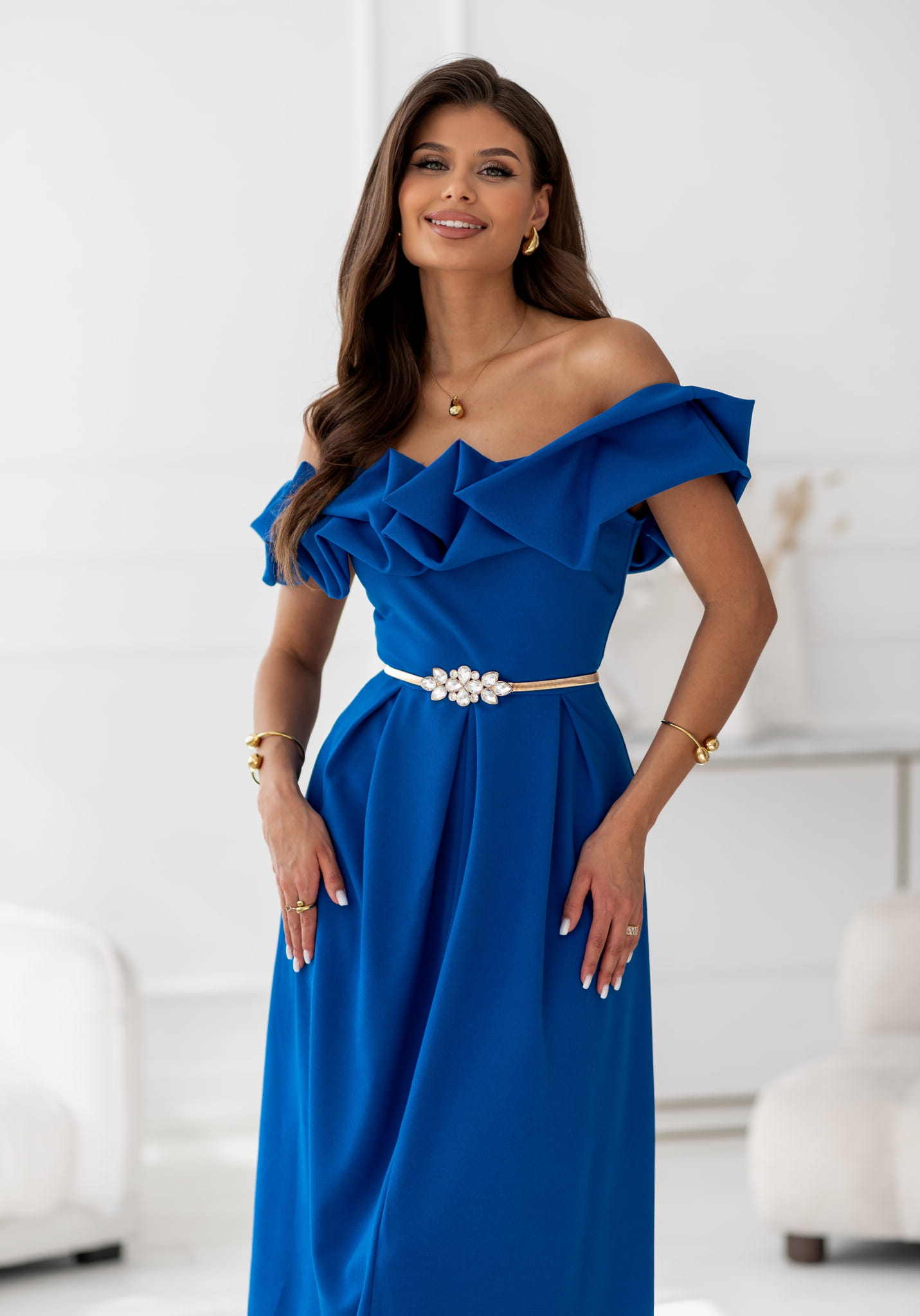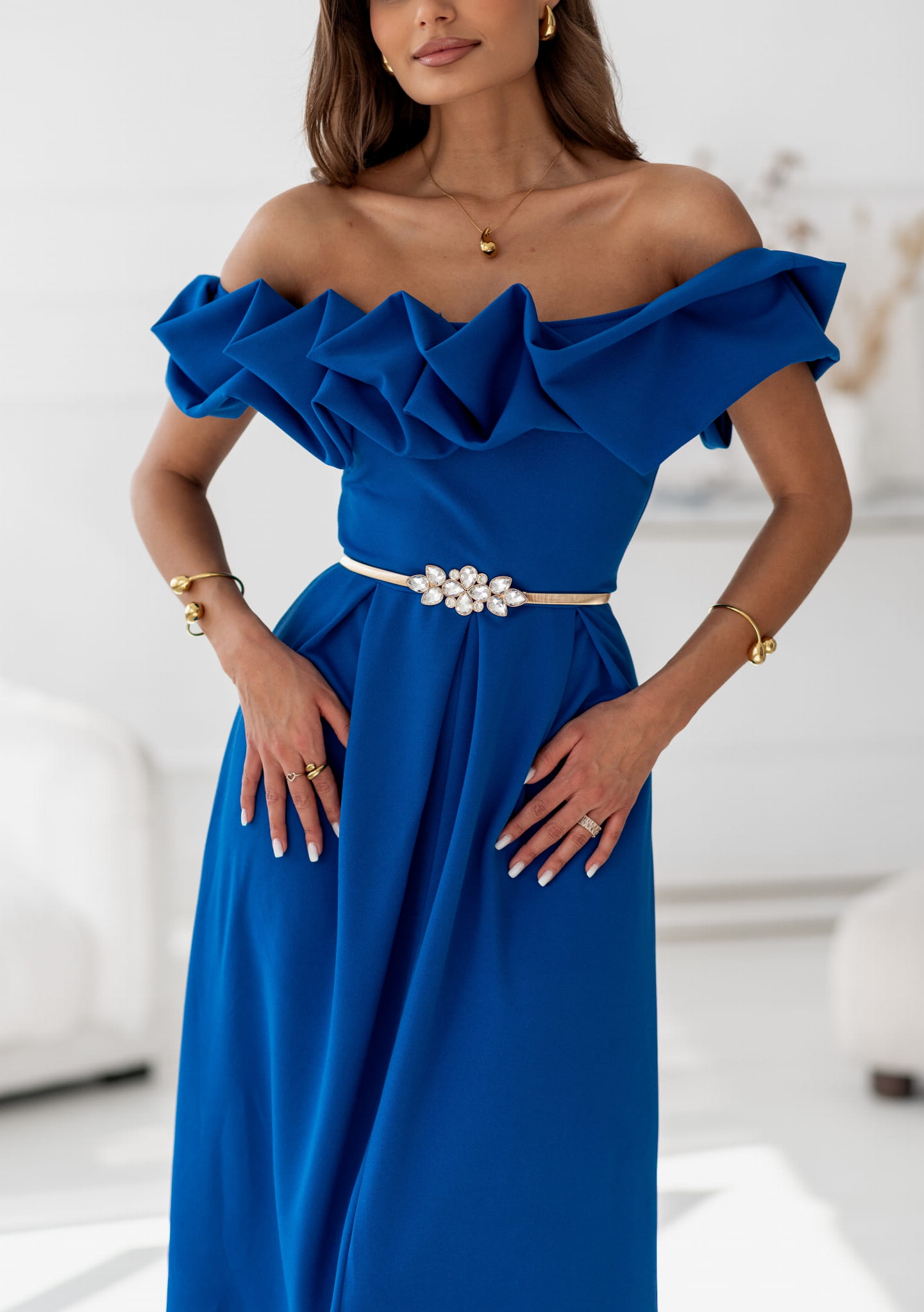 Stylowa i kobieca sukienka w intensywnym, chabrowym kolorze, idealna na wyjątkowe okazje. Model wyróżnia się efektowną, przestrzenną falbaną przy dekolcie, która pięknie podkreśla linię ramion i nadaje całości eleganckiego charakteru. Rozkloszowany dół o długości Midi modeluje sylwetkę, a gładka, lekko elastyczna tkanina zapewnia komfort noszenia. Sukienka sprzedawana bez paska widocznego na zdjęciach. Pasek można dokupić w dziale Galanteria.