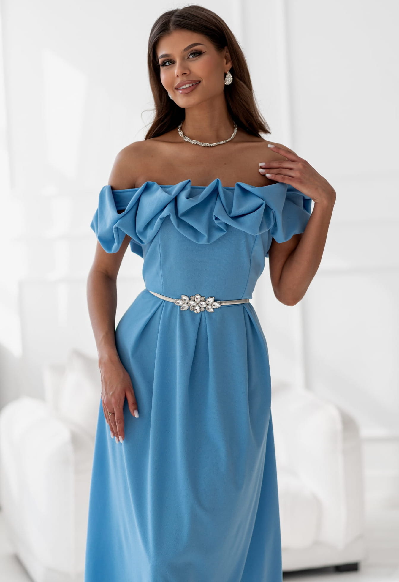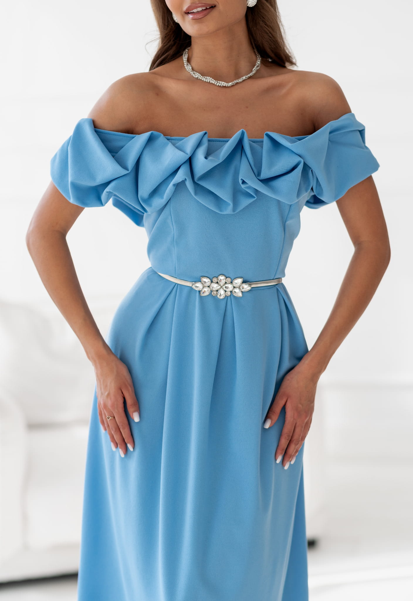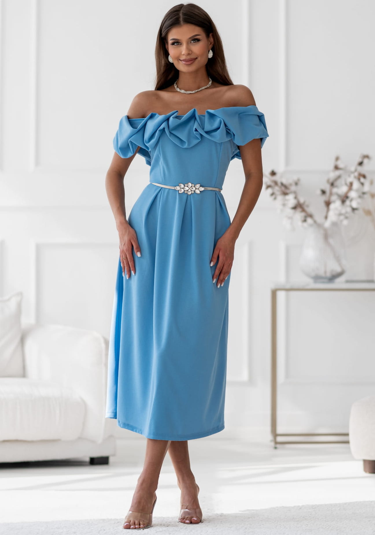 Stylowa i kobieca sukienka w delikatnym, niebieskim kolorze, idealna na wyjątkowe okazje. Model wyróżnia się efektowną, przestrzenną falbaną przy dekolcie, która pięknie podkreśla linię ramion i nadaje całości eleganckiego charakteru. Rozkloszowany dół o długości Midi modeluje sylwetkę, a gładka, lekko elastyczna tkanina zapewnia komfort noszenia. Sukienka sprzedawana bez paska widocznego na zdjęciach. Pasek można dokupić w dziale Galanteria.