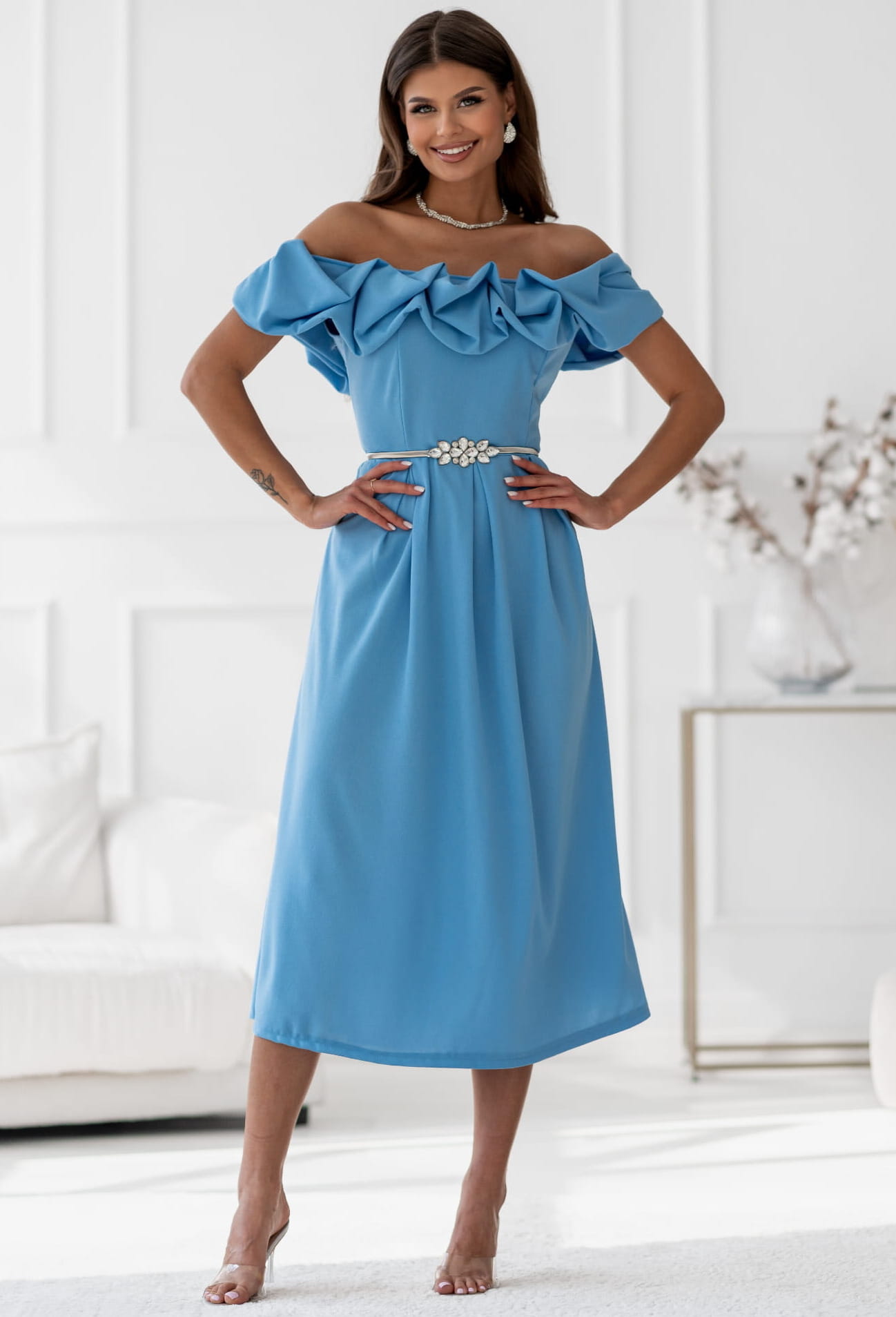 Sukienka Ester z efektowną falbaną MIDI rozkloszowana niebieska