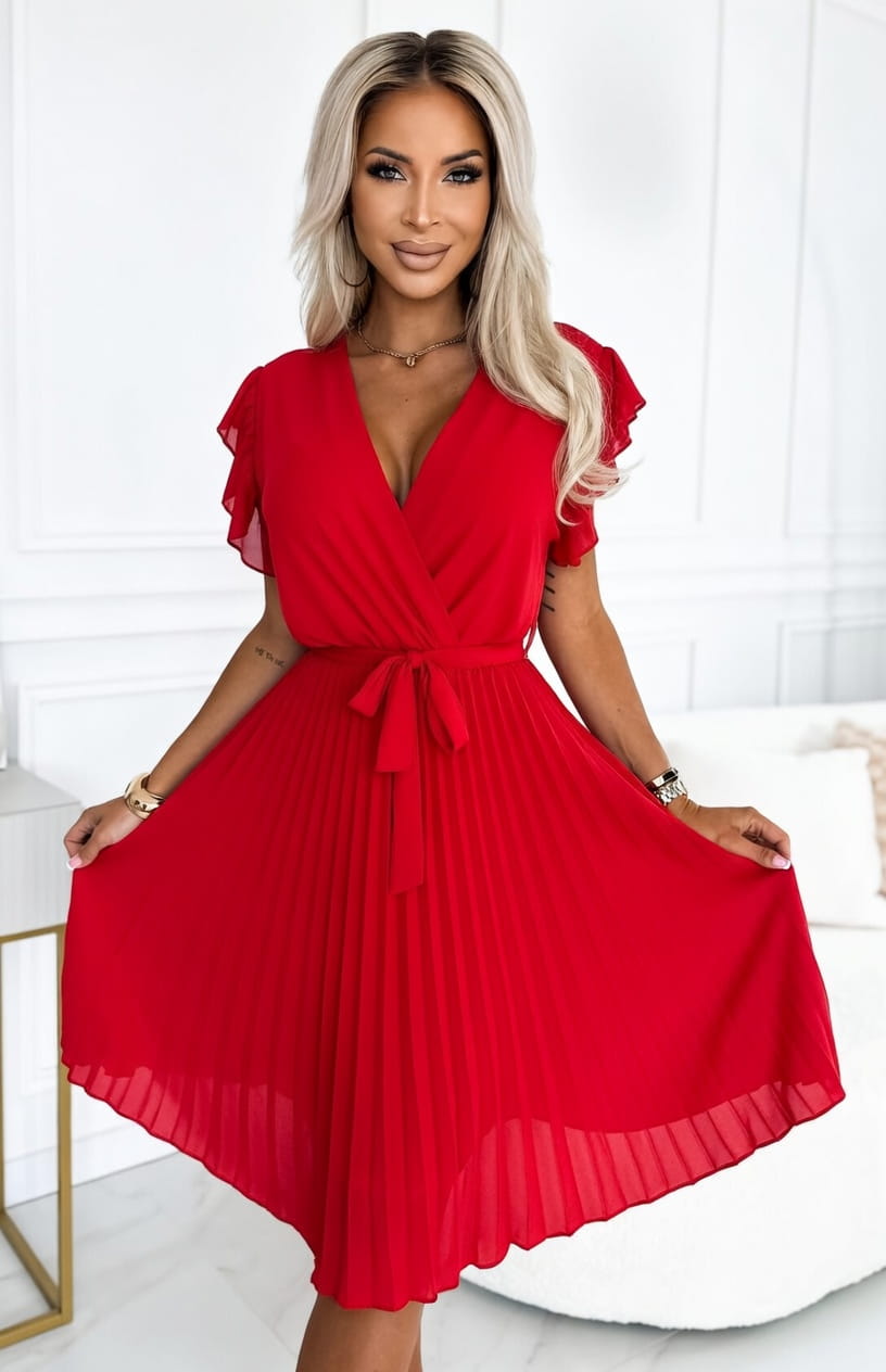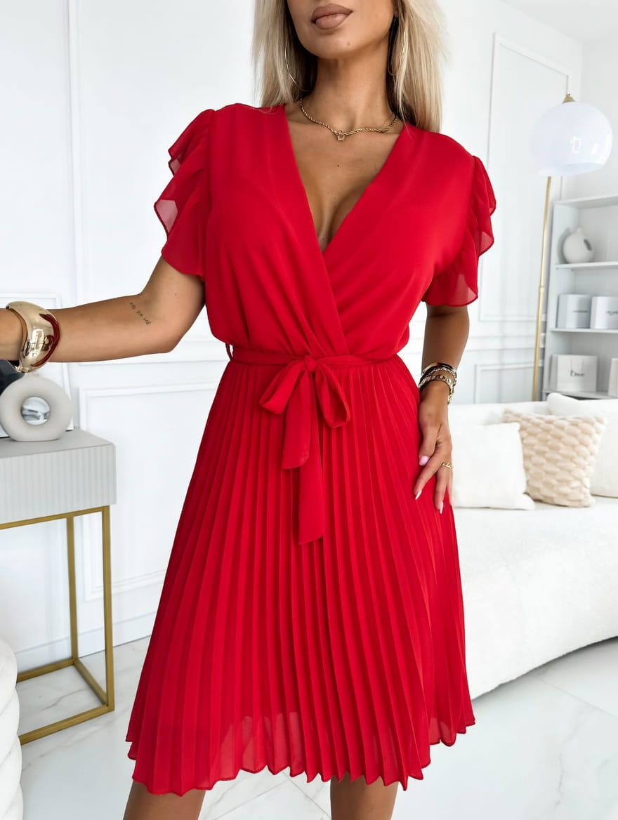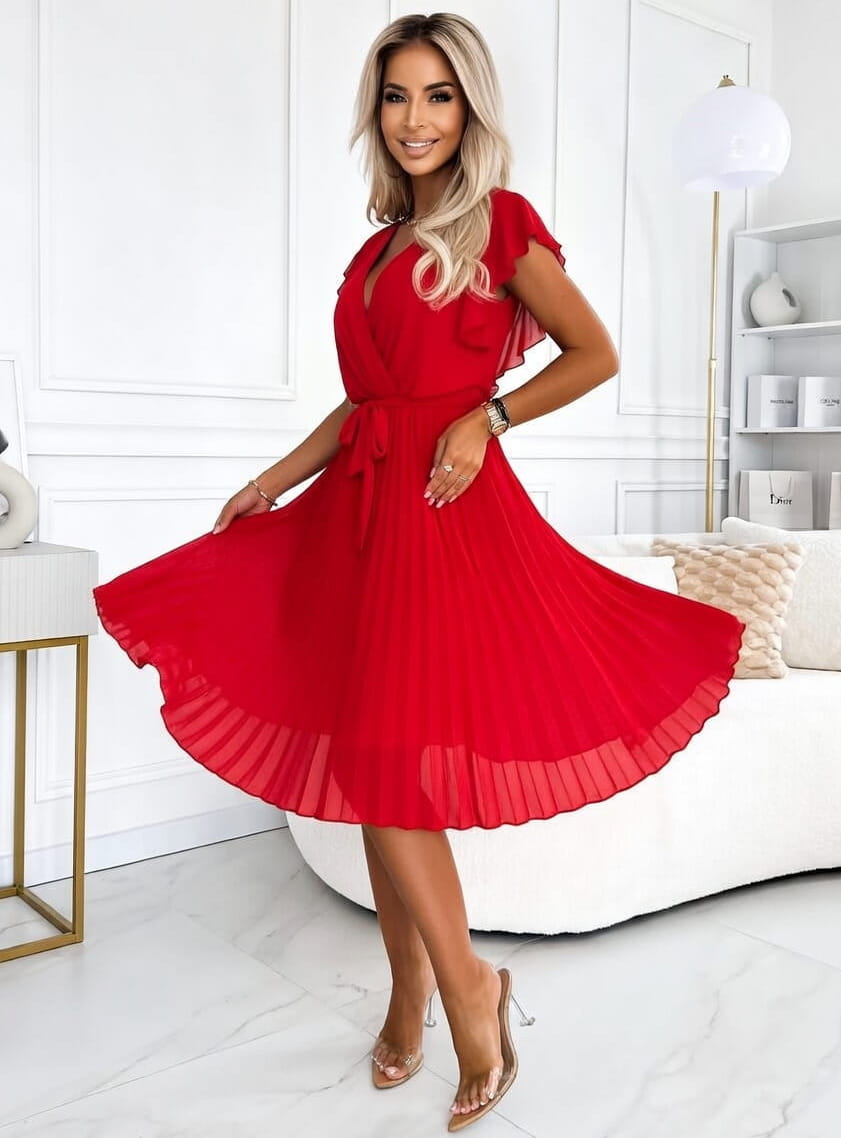 Włoska sukienka kopertowa Plisa to elegancki i bardzo kobiecy krój. Sukienka na podszewce, w pasie gumka i dodatkowe wiązanie.
