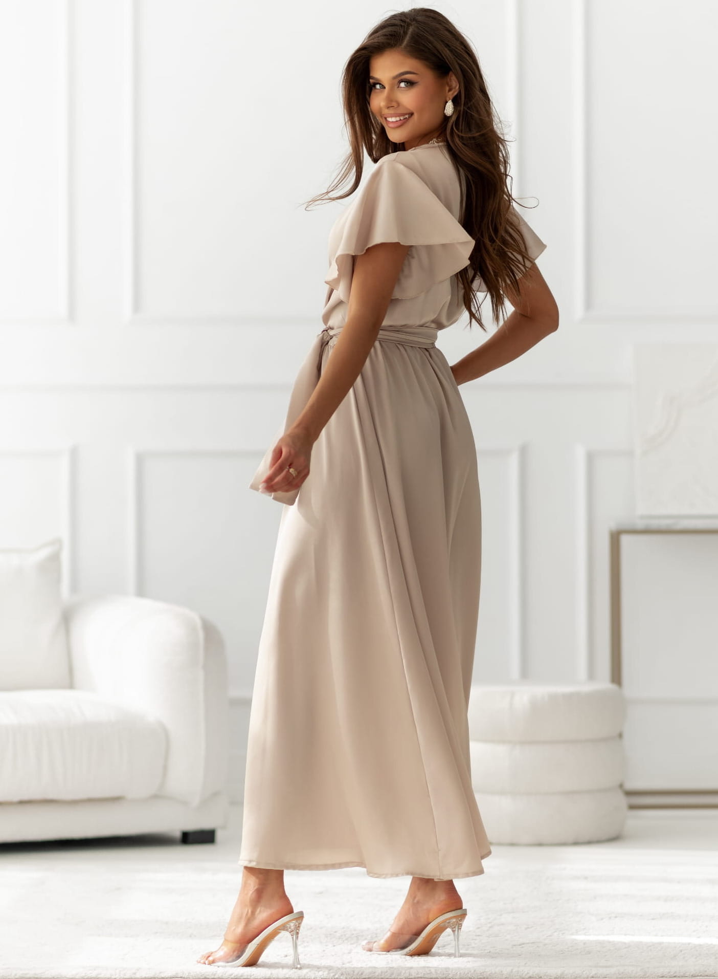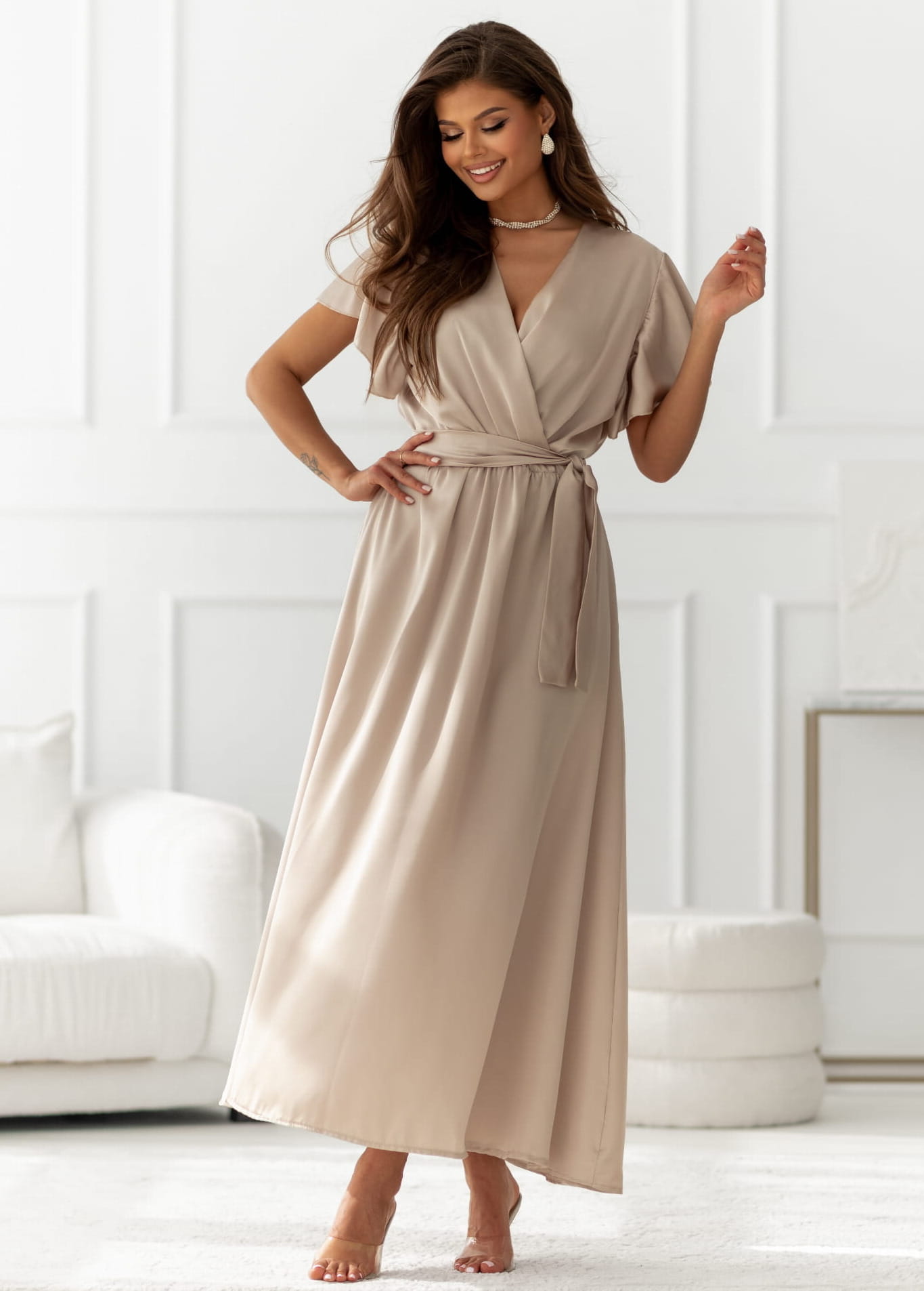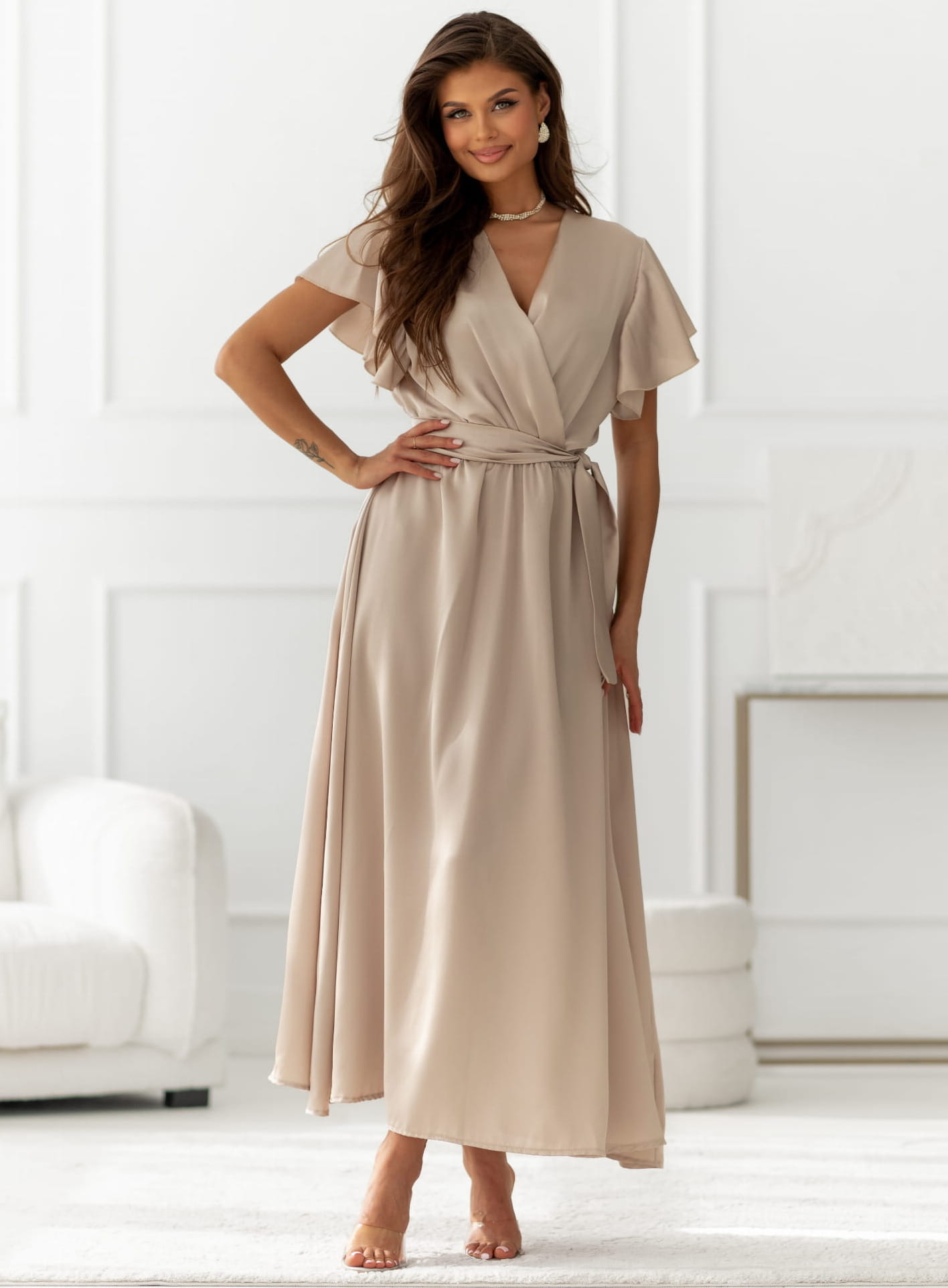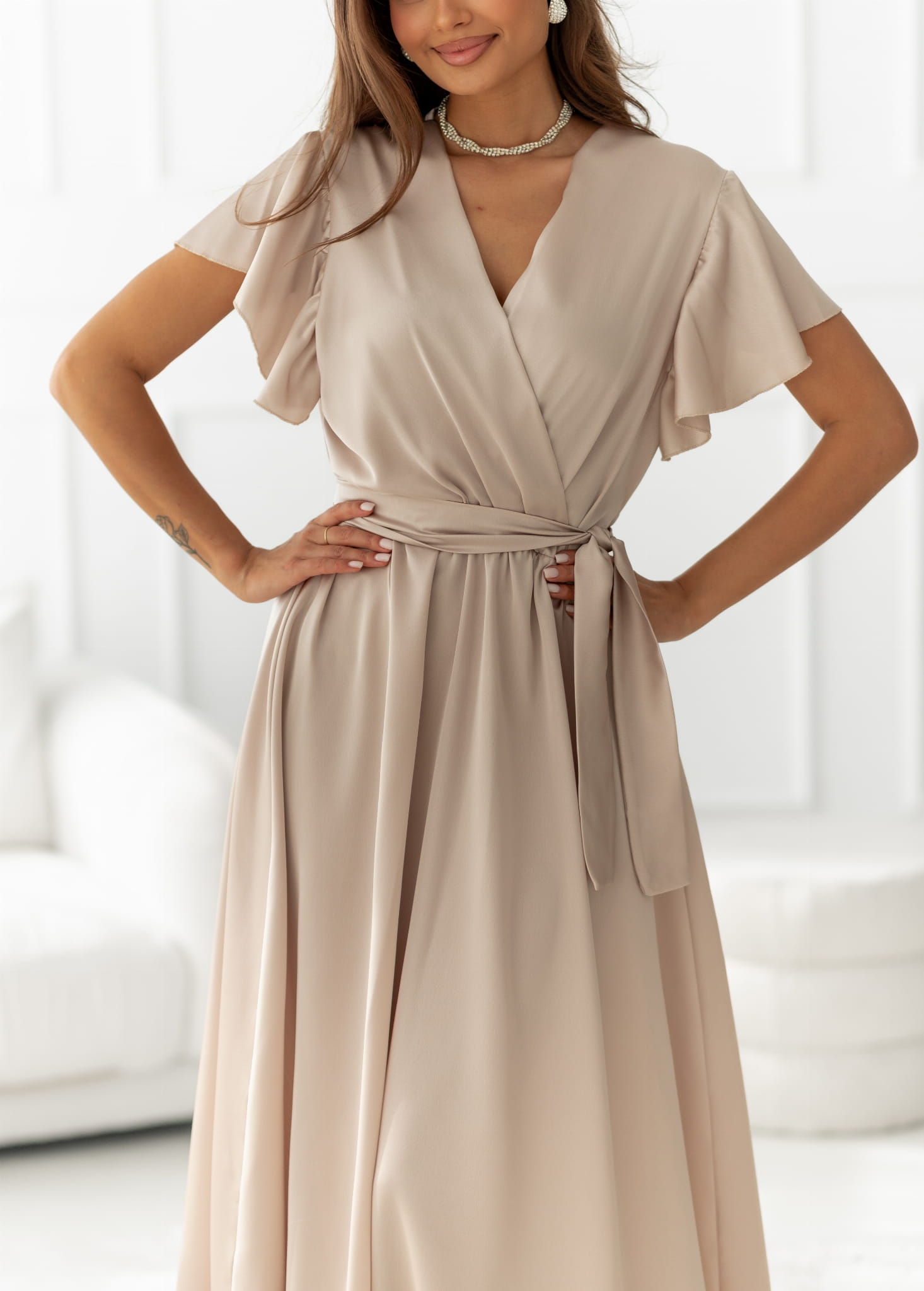 Sukienka w kolorze jasnego beżu to inwestycja w ponadczasowy styl. Satynowy materiał sprawia, że kreacja "pracuje" przy każdym ruchu .