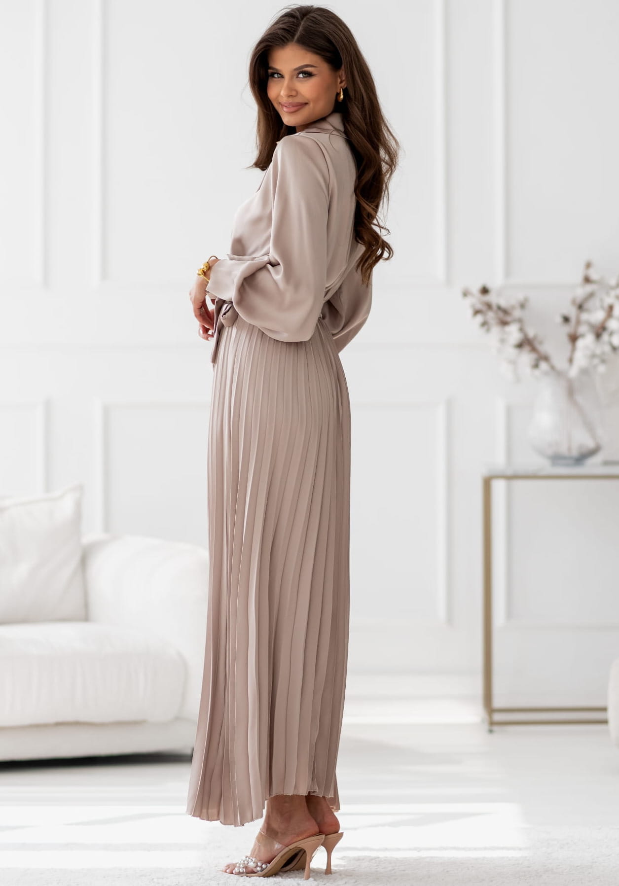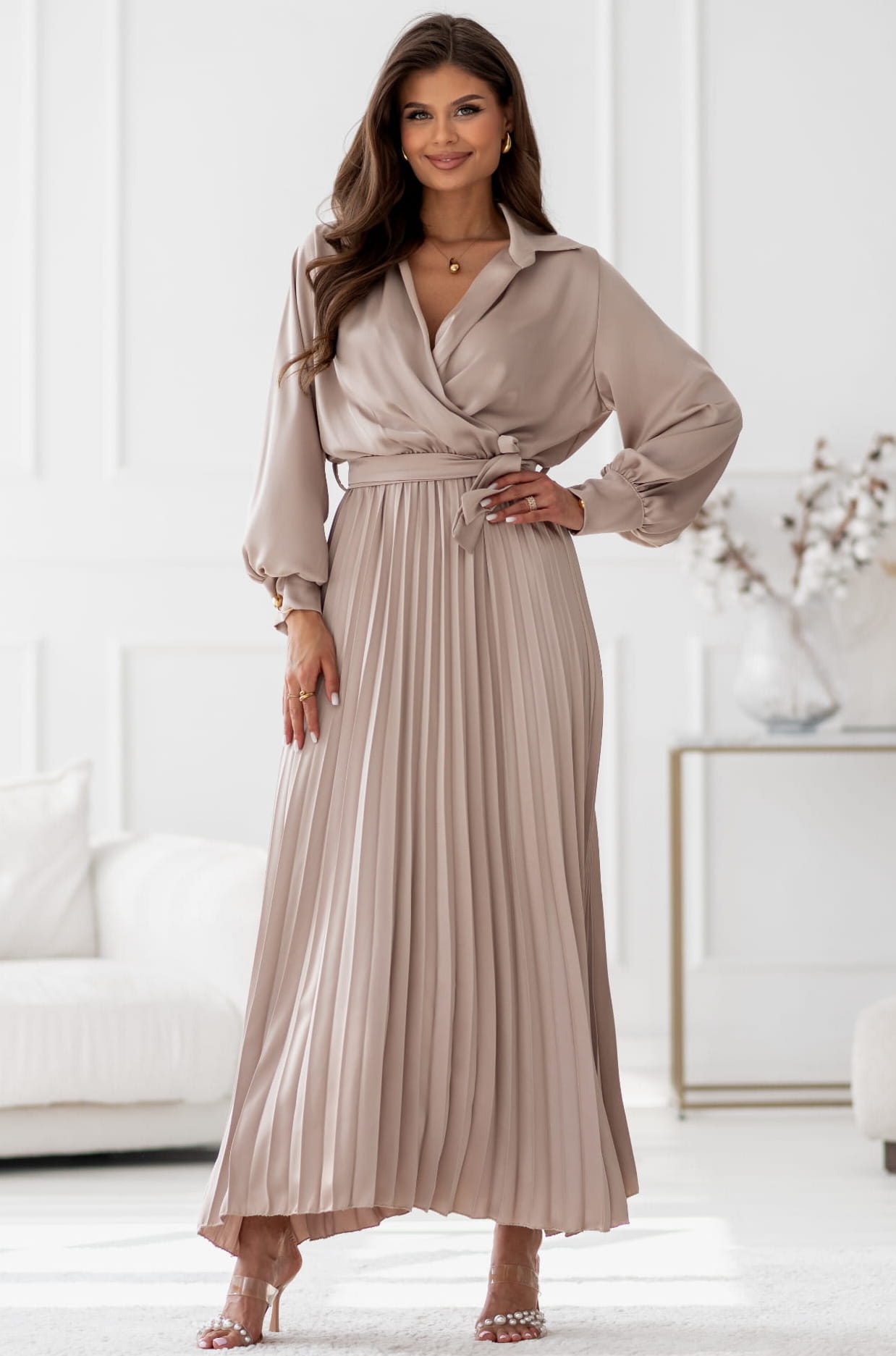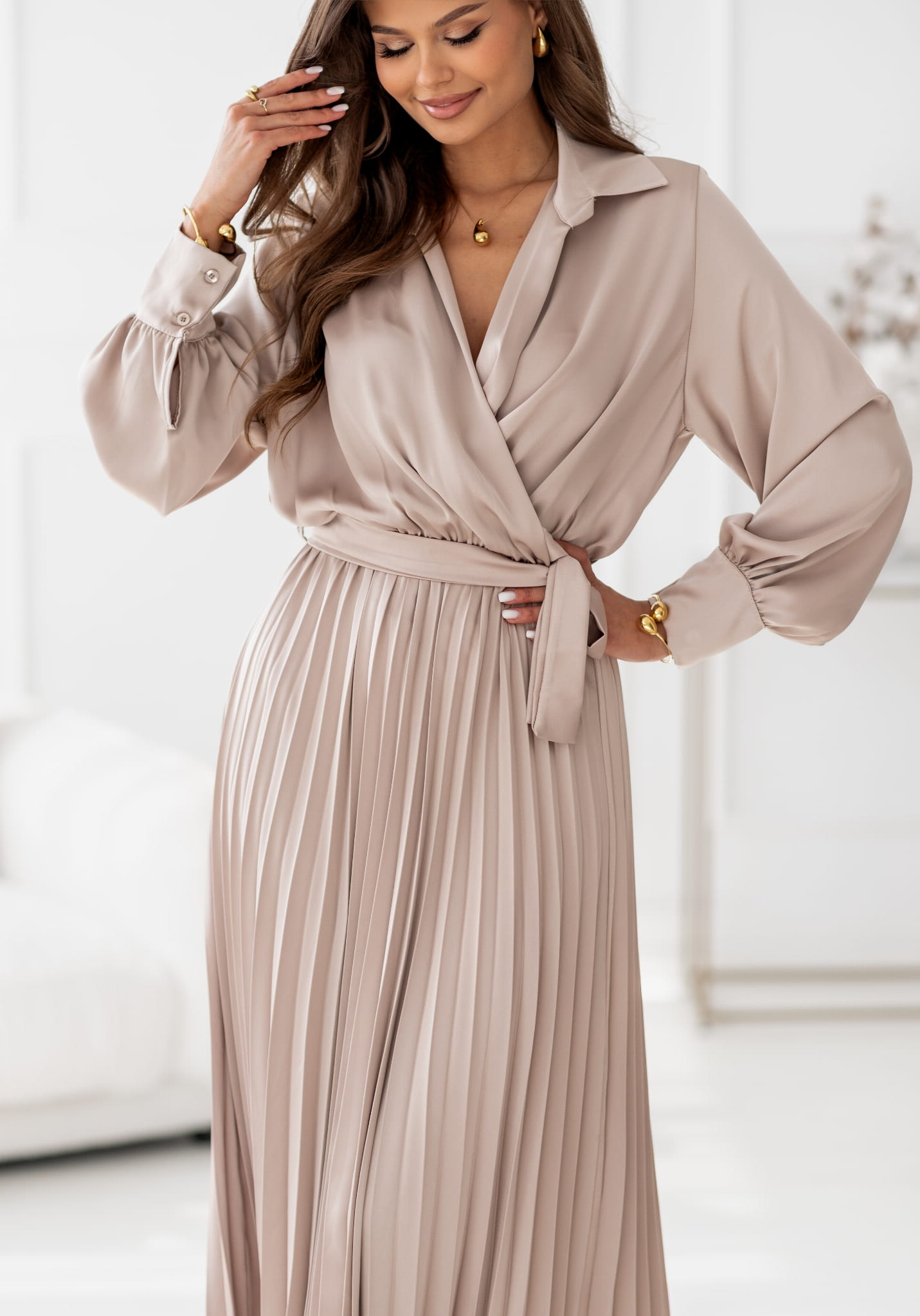Sukienka Maxi satyna plisa z rękawem beżowa