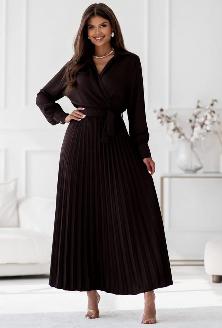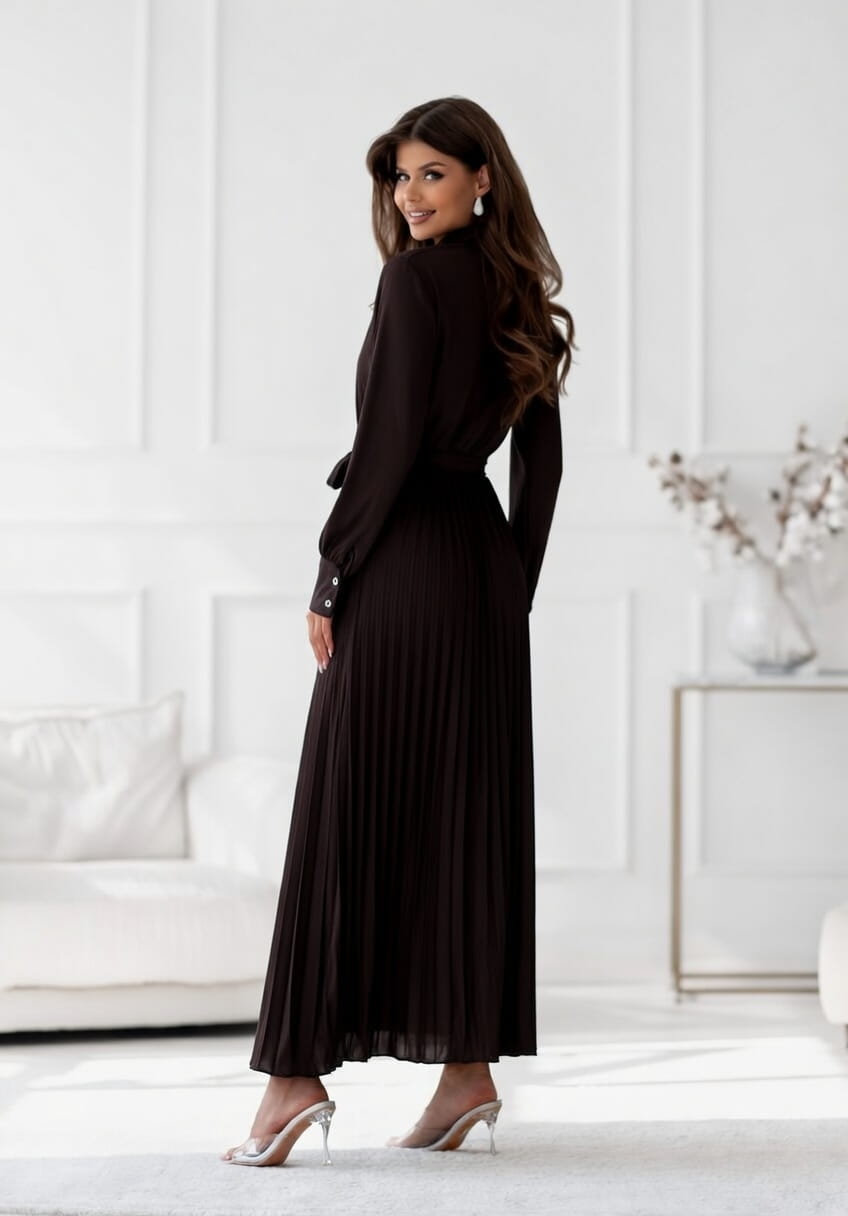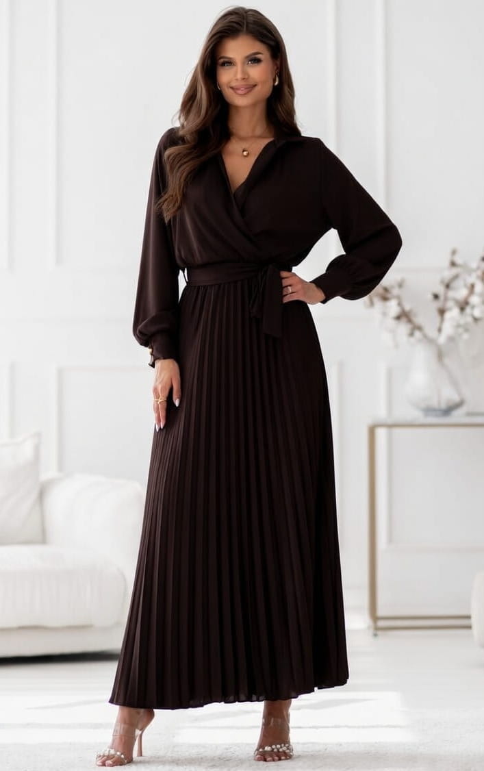 Sukienka Maxi satyna plisa z rękawem gorzka czekolada