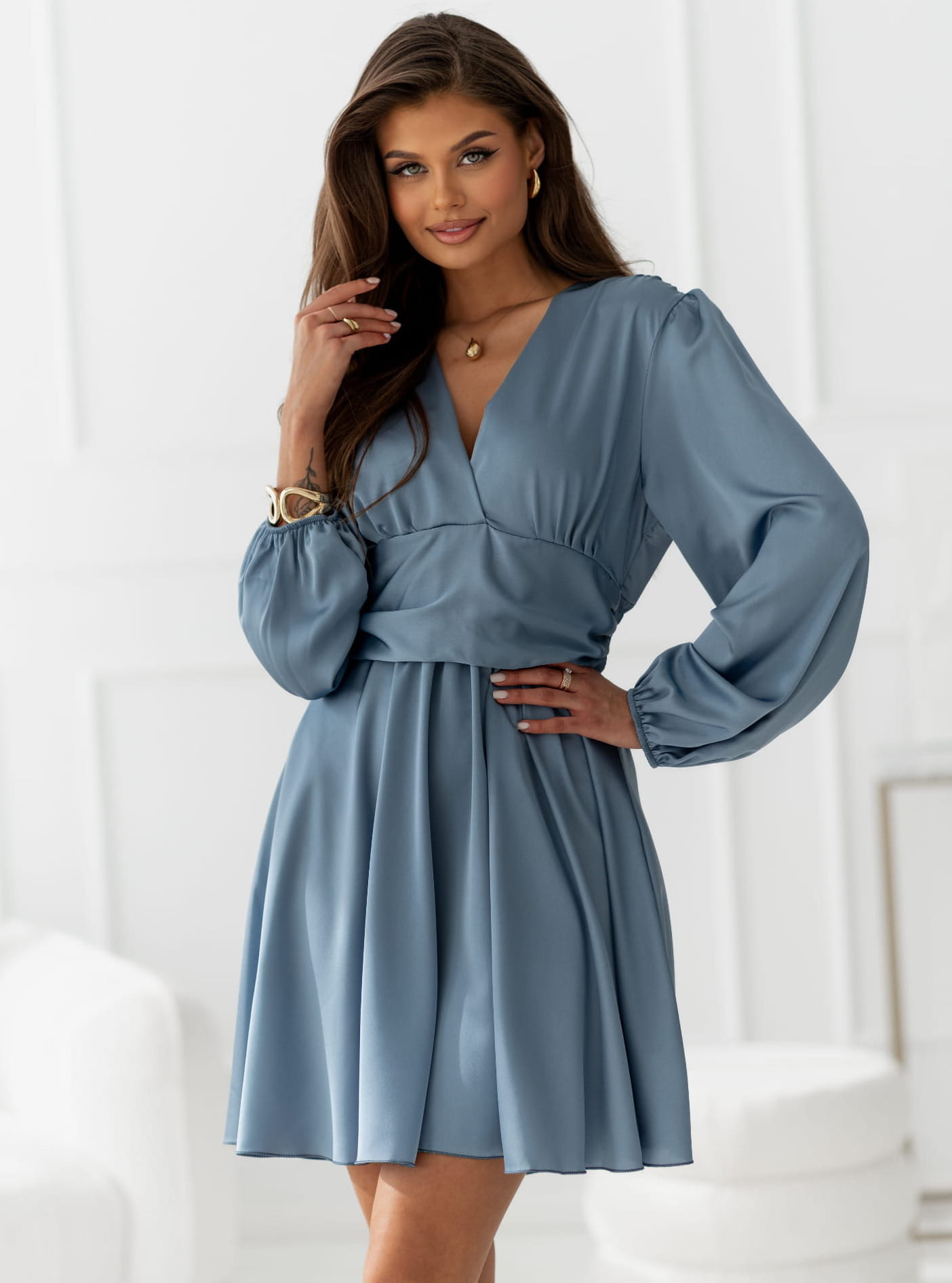 Postaw na luksusowy look i podkreśl swoją kobiecość dzięki naszej najnowszej propozycji. Ta satynowa sukienka mini w odcieniu niebieskim to idealny wybór na specjalne okazje, wesela, chrzciny czy romantyczne kolacje. Wykonana z materiału o delikatnym połysku, pięknie pracuje w ruchu, dodając stylizacji szlachetnego charakteru. Możliwość KP.