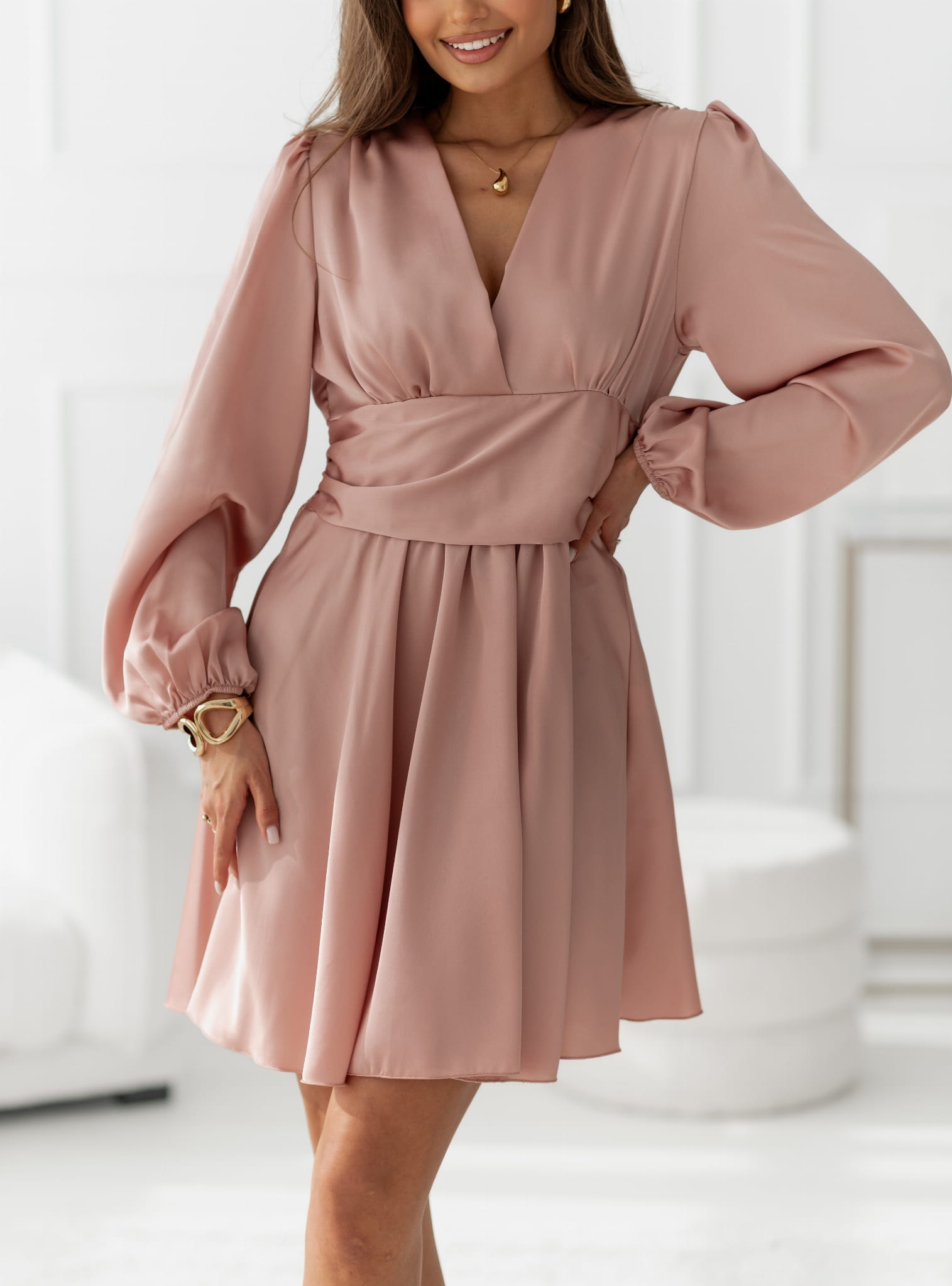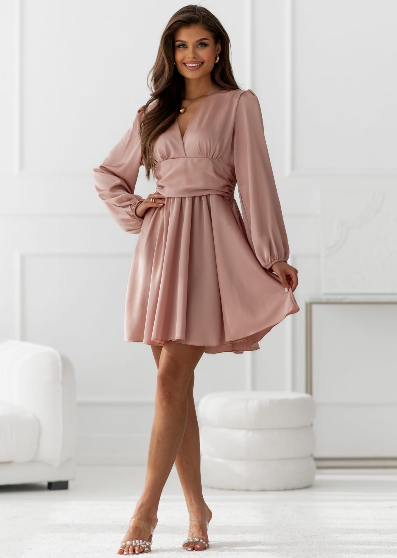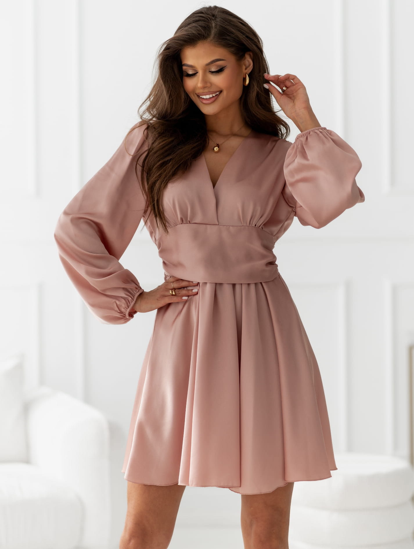 Postaw na luksusowy look i podkreśl swoją kobiecość dzięki naszej najnowszej propozycji. Ta satynowa sukienka mini w odcieniu delikatnego, pudrowego różu to idealny wybór na specjalne okazje, wesela, chrzciny czy romantyczne kolacje. Wykonana z materiału o delikatnym połysku, pięknie pracuje w ruchu, dodając stylizacji szlachetnego charakteru. Możliwość KP.