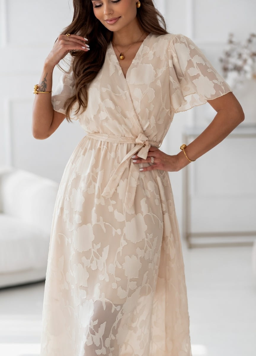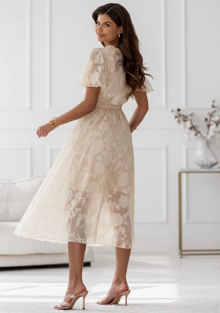 Romantyczna i lekka sukienka idealna na wiosenne i letnie stylizacje. Model wykonany z delikatnej, półtransparentnej tkaniny z tłoczoną fakturą w nieregularny, kwiatowy wzór, który nadaje całości wyjątkowej elegancji i lekkości. Zwiewny fason pięknie układa się w ruchu, podkreślając kobiecą sylwetkę. Długość MIDI idealna na wiele okazji. Możliwość KP.