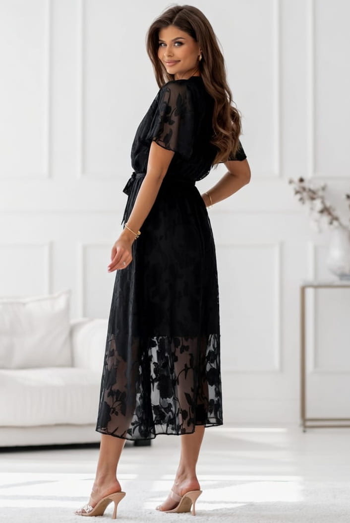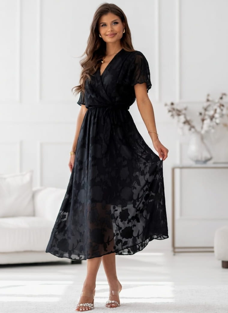 Romantyczna i lekka sukienka idealna na wiosenne i letnie stylizacje. Model wykonany z delikatnej, półtransparentnej tkaniny z tłoczoną fakturą w nieregularny, kwiatowy wzór, który nadaje całości wyjątkowej elegancji i lekkości. Zwiewny fason pięknie układa się w ruchu, podkreślając kobiecą sylwetkę. Długość MIDI idealna na wiele okazji. Możliwość KP.