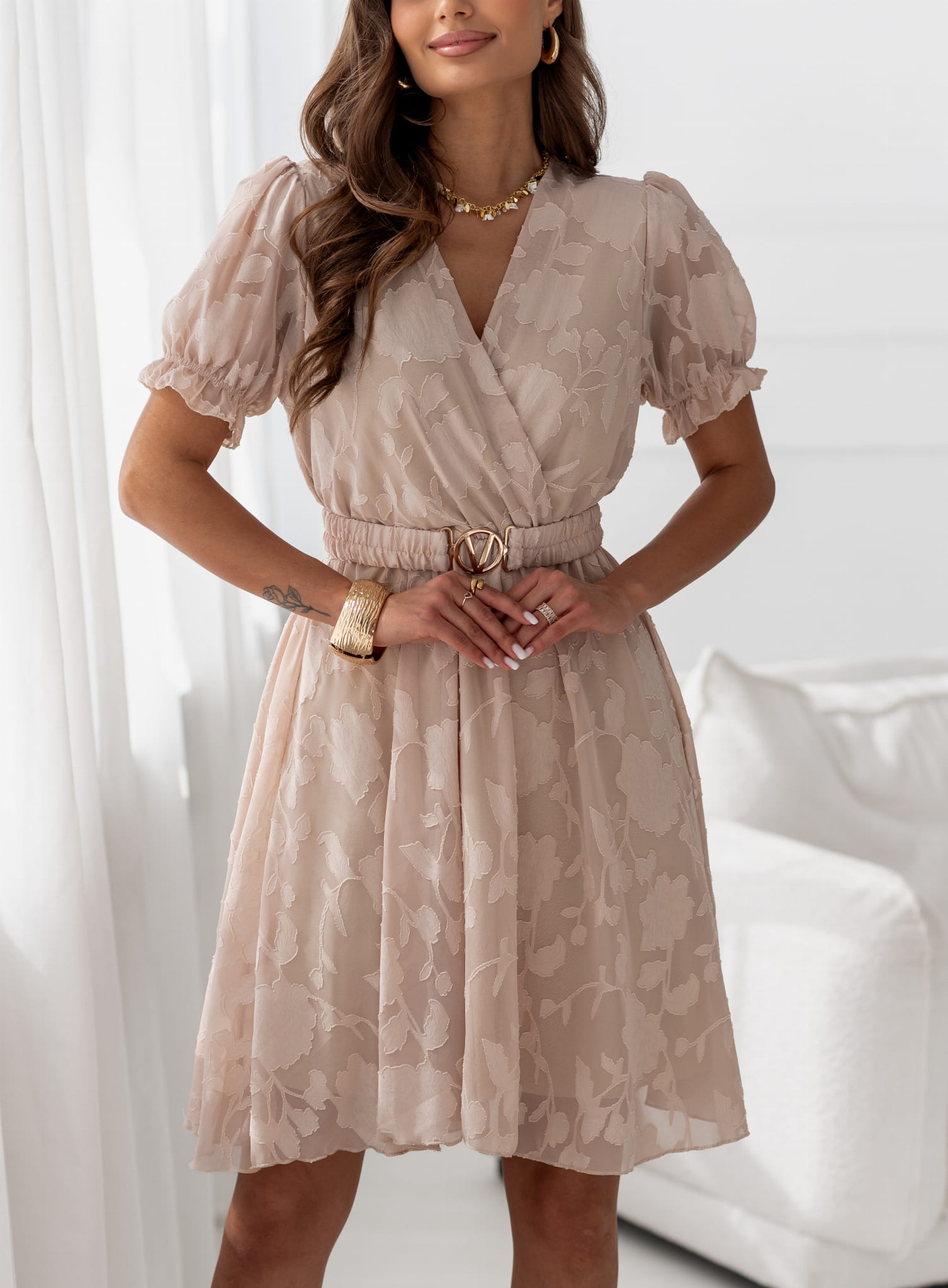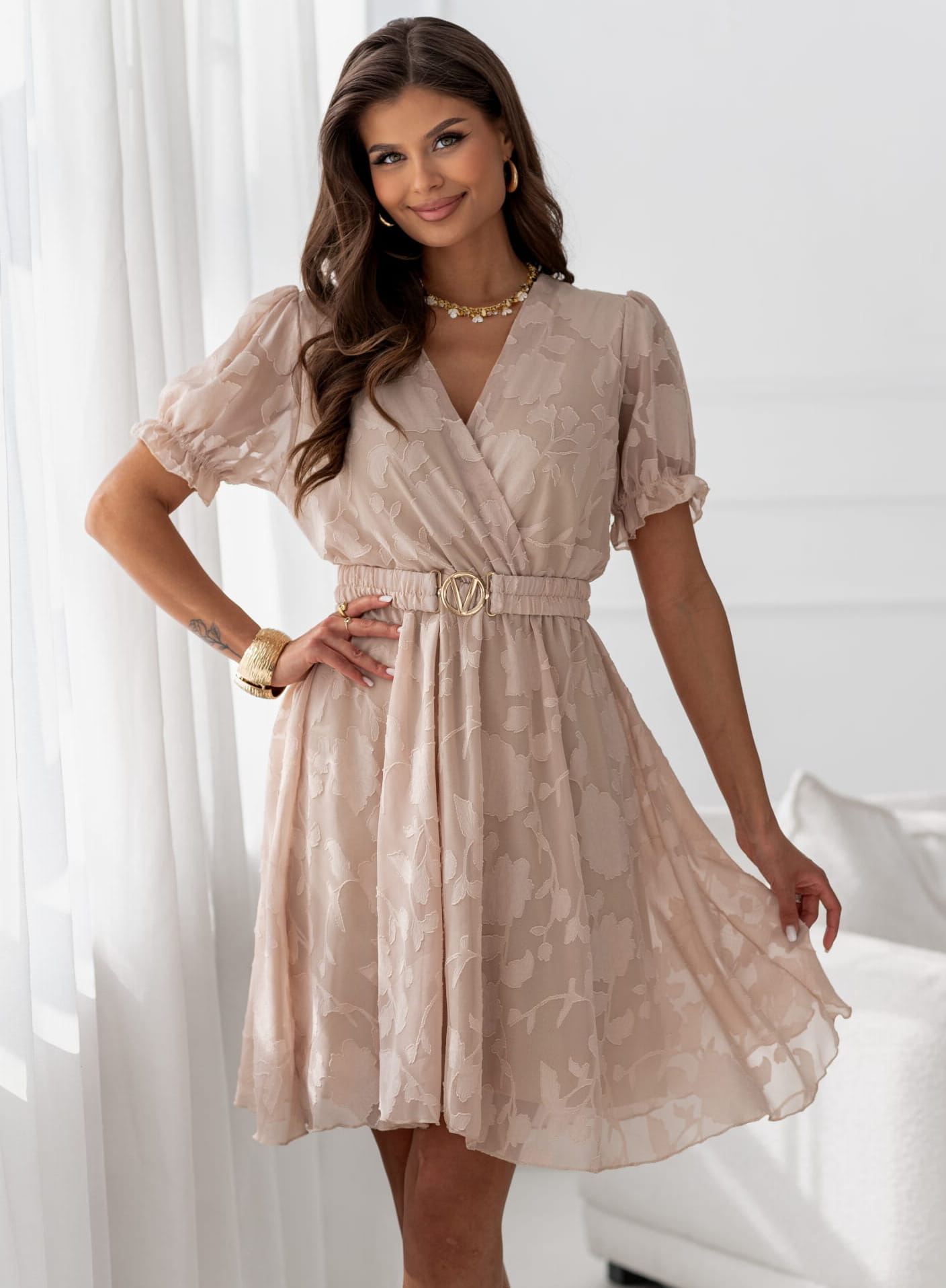 Romantyczna i lekka sukienka idealna na wiosenne i letnie stylizacje. Model wykonany z delikatnej, półtransparentnej tkaniny z tłoczoną fakturą w nieregularny, kwiatowy wzór, który nadaje całości wyjątkowej elegancji i lekkości. Zwiewny fason pięknie układa się w ruchu, podkreślając kobiecą sylwetkę. Możliwość KP.