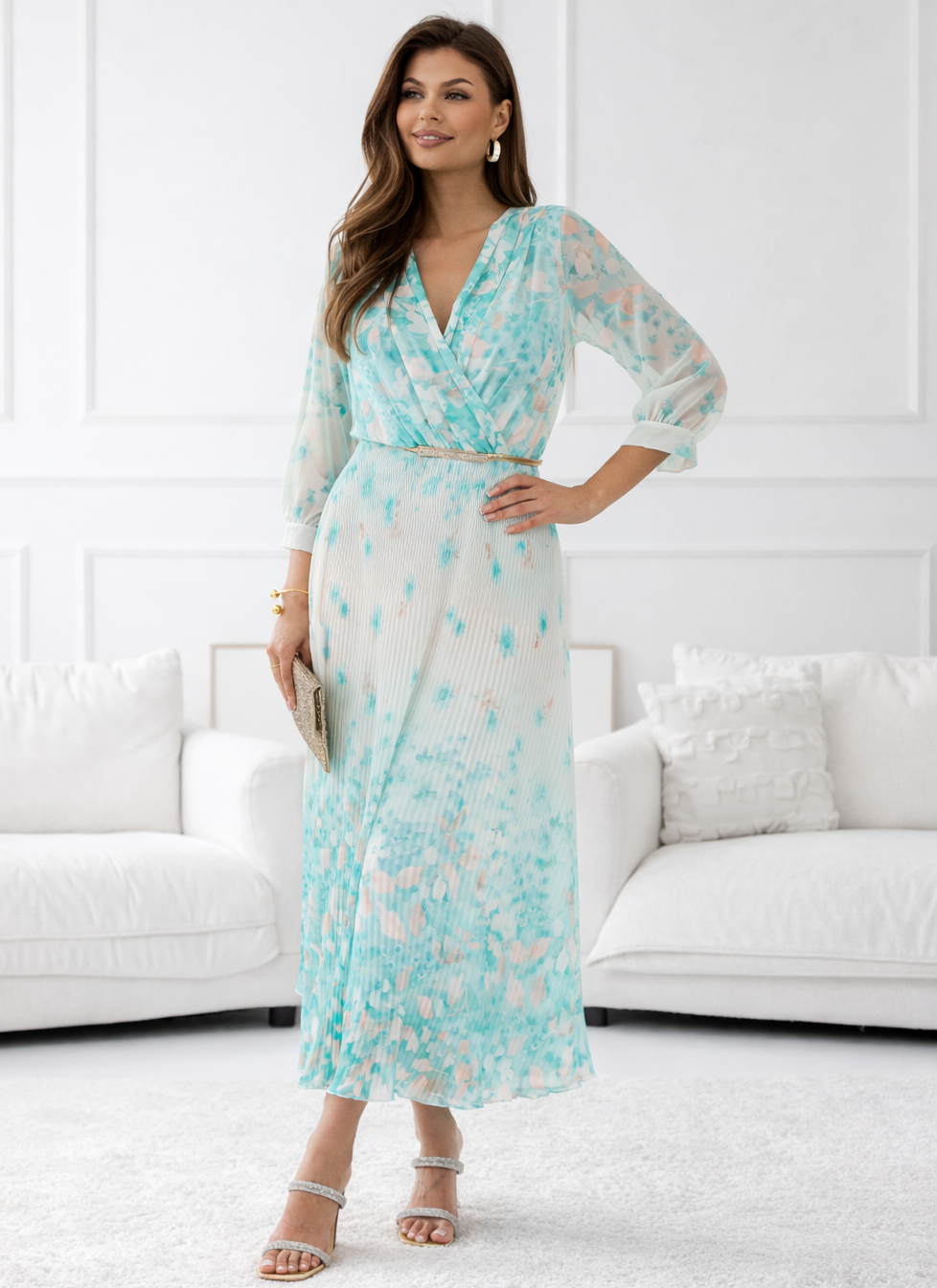 Włoska sukienka wizytowa z kopertowym dekoltem.Możliwość KP, rękaw długości 3/4. Sukienka sprzedawana bez paska widocznego na zdjęciach. Pasek można dokupić w dziale Galanteria.
