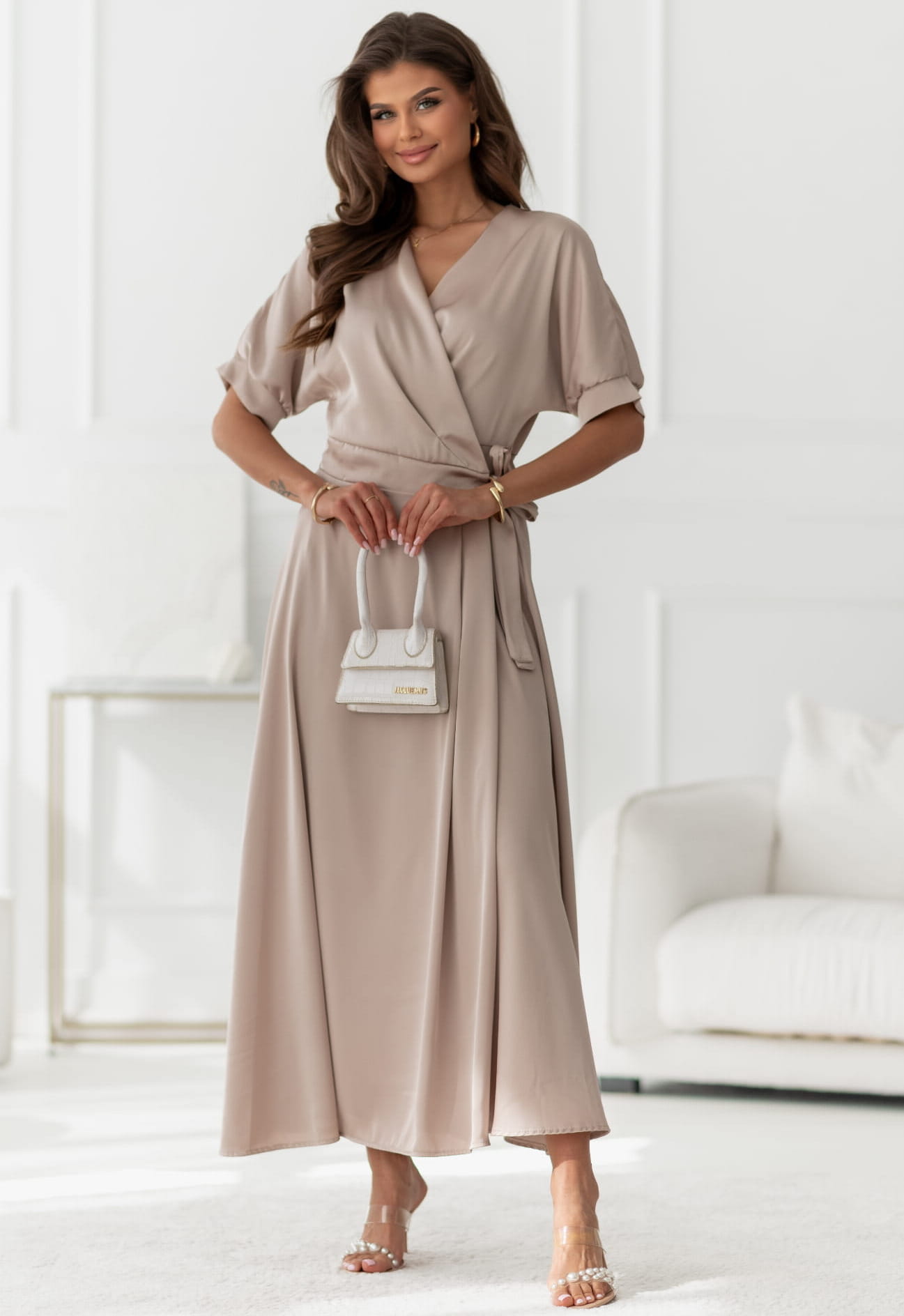 Sukienka kimonowa z wiązaniem MAXI satyna beżowa