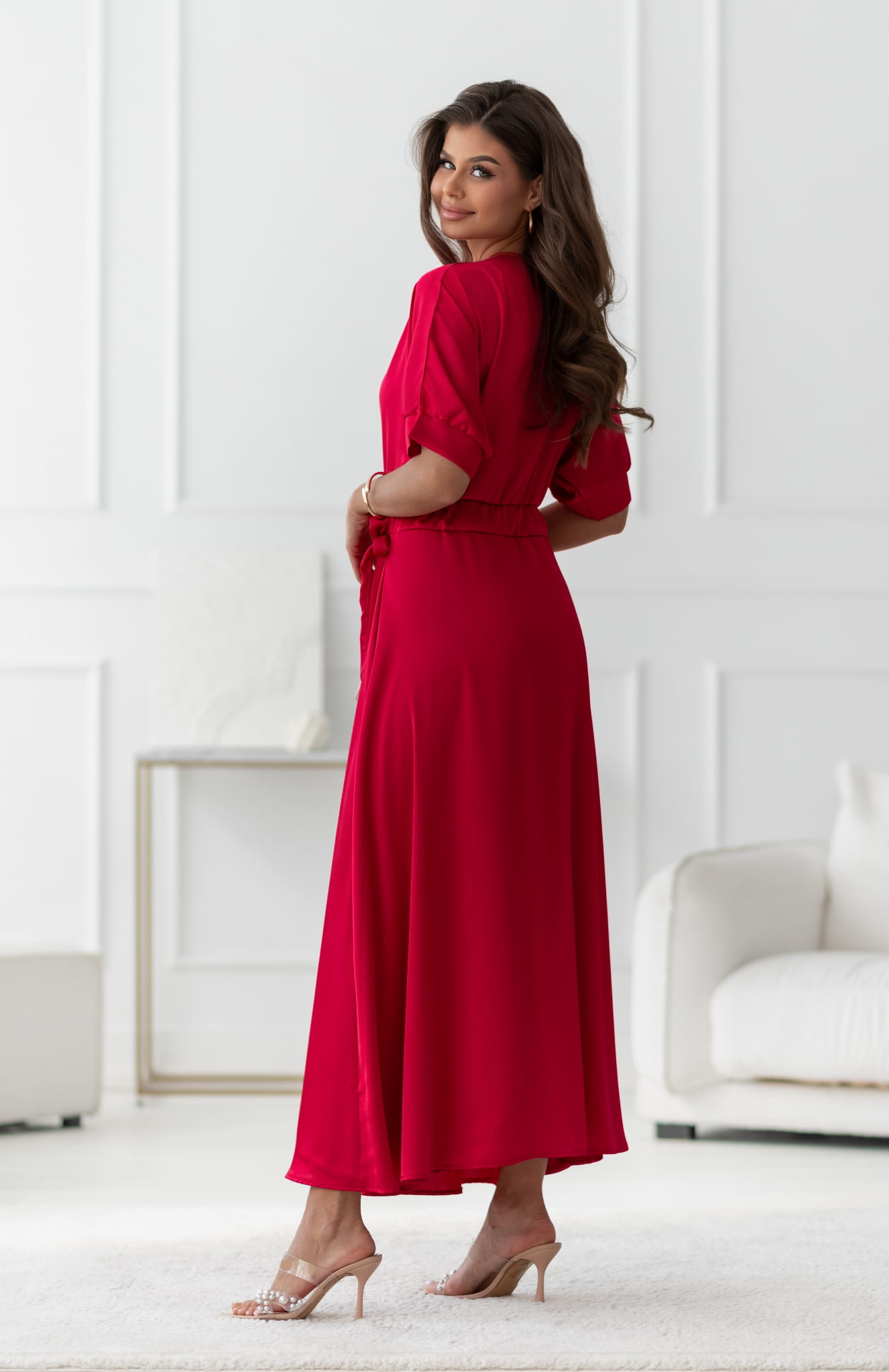 Elegancja w codziennym wydaniu. Sukienka to model kopertowej sukienki tzw. kimono, który łączy luksusową teksturę z niezwykle ponadczasowym fasonem. Wykonana z wysokogatunkowej, mięsistej satyny w odcieniu czerwieni, pięknie odbija światło, nadając cerze blasku. To idealna propozycja na komunie, chrzciny oraz przyjęcia koktajlowe. Lekkości dodaje krótki rękaw oraz kopertowe wiązanie dzięki któremu z łatwością sukienka dopasuje się do figury. Możliwość KP.