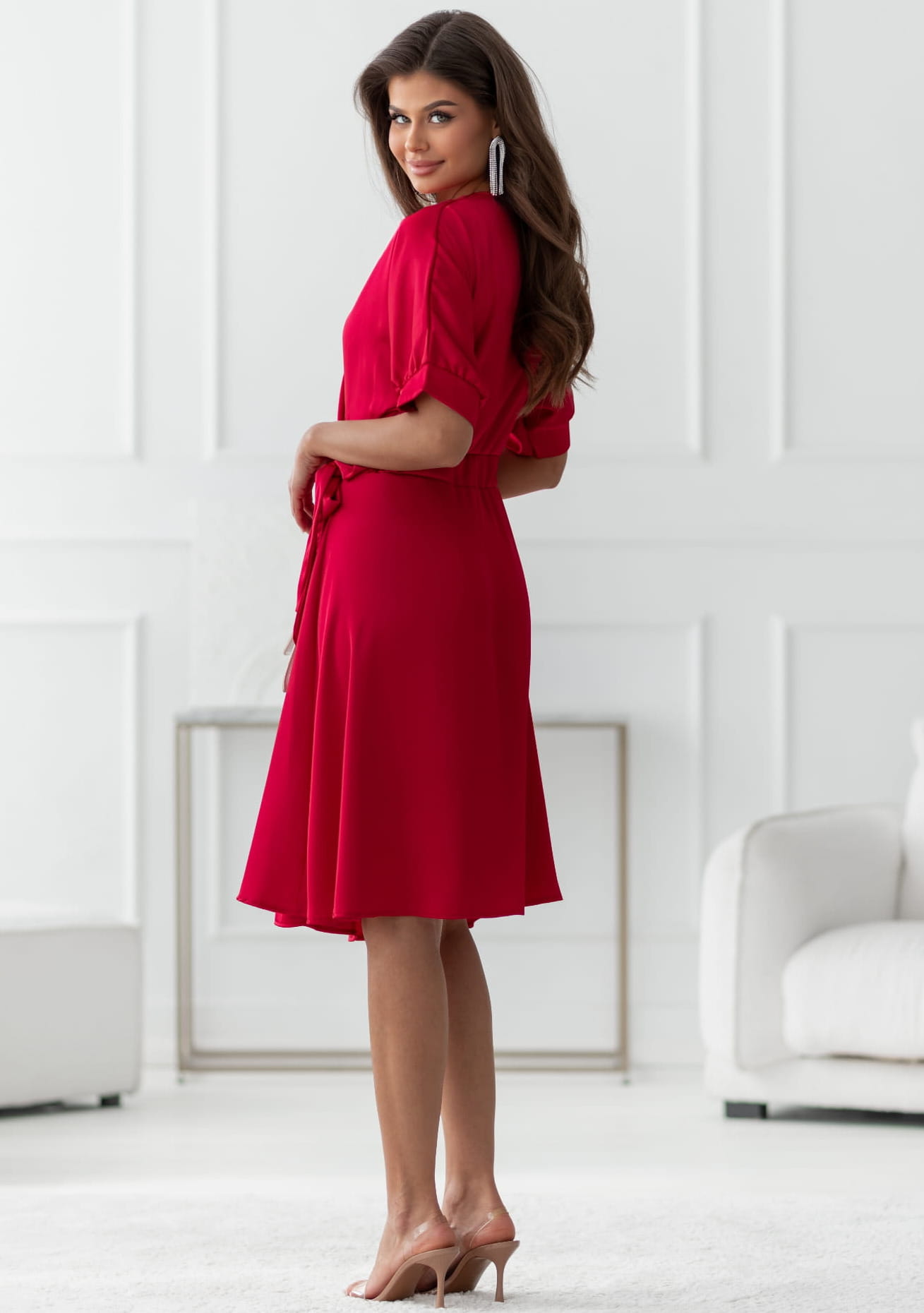 Elegancja w codziennym wydaniu. Sukienka to model kopertowej sukienki tzw. kimono, który łączy luksusową teksturę z niezwykle ponadczasowym fasonem. Wykonana z wysokogatunkowej, mięsistej satyny w odcieniu czerwieni, pięknie odbija światło, nadając cerze blasku. To idealna propozycja na komunie, chrzciny oraz przyjęcia koktajlowe. Lekkości dodaje krótki rękaw oraz kopertowe wiązanie dzięki któremu z łatwością sukienka dopasuje się do figury. Możliwość KP.