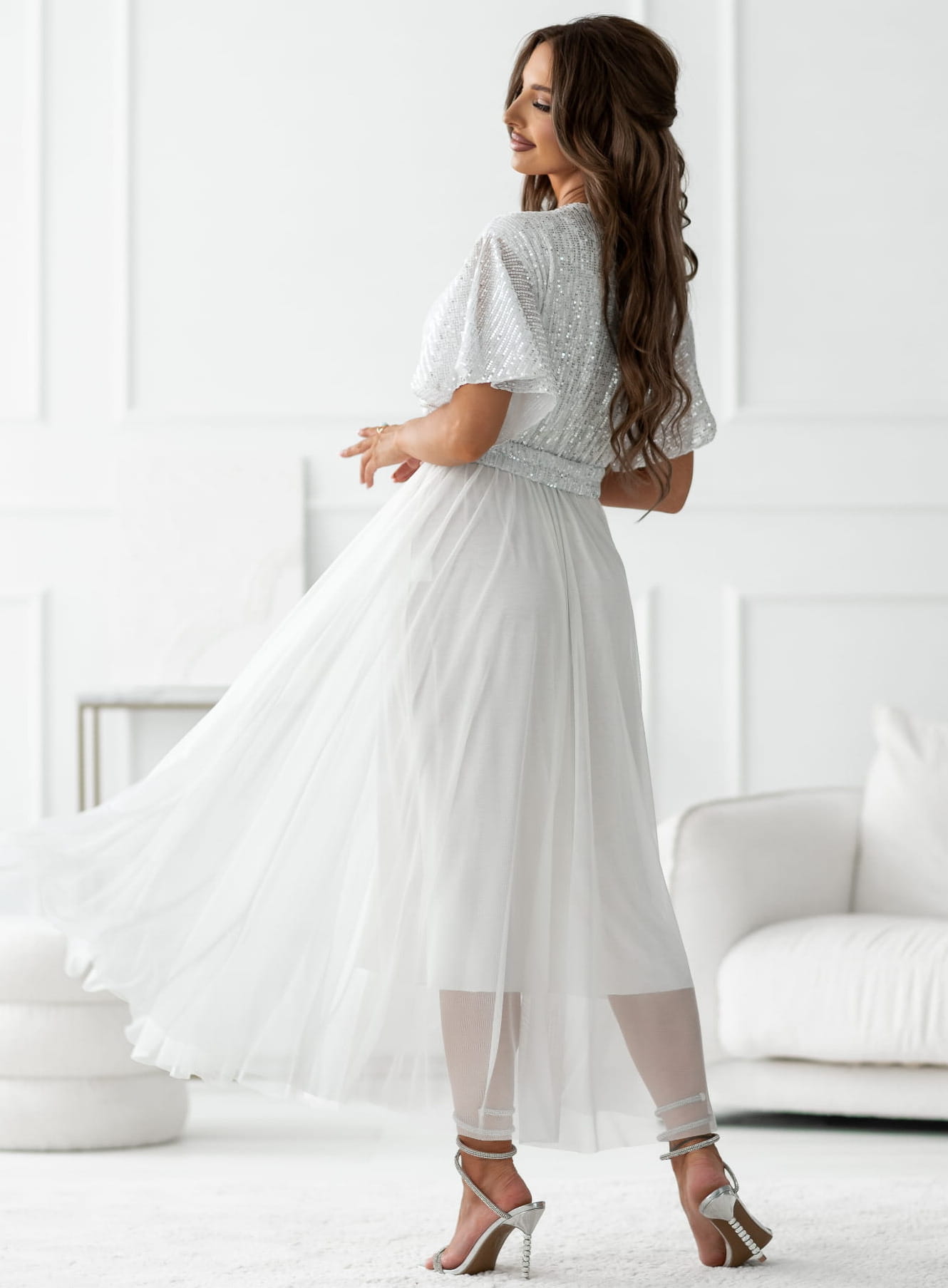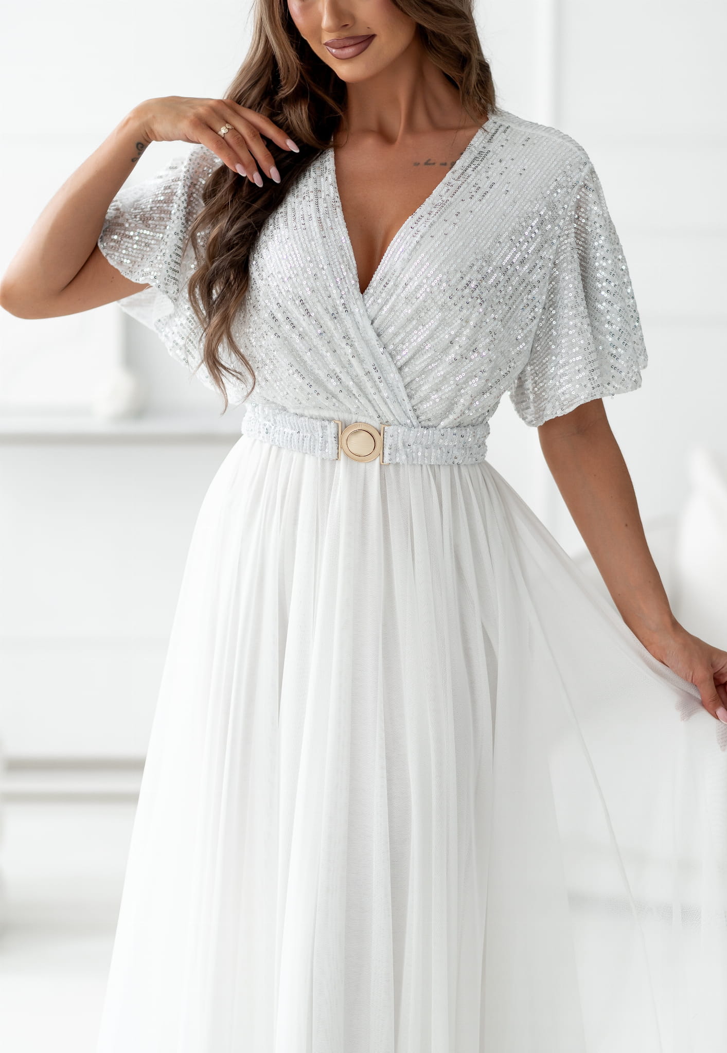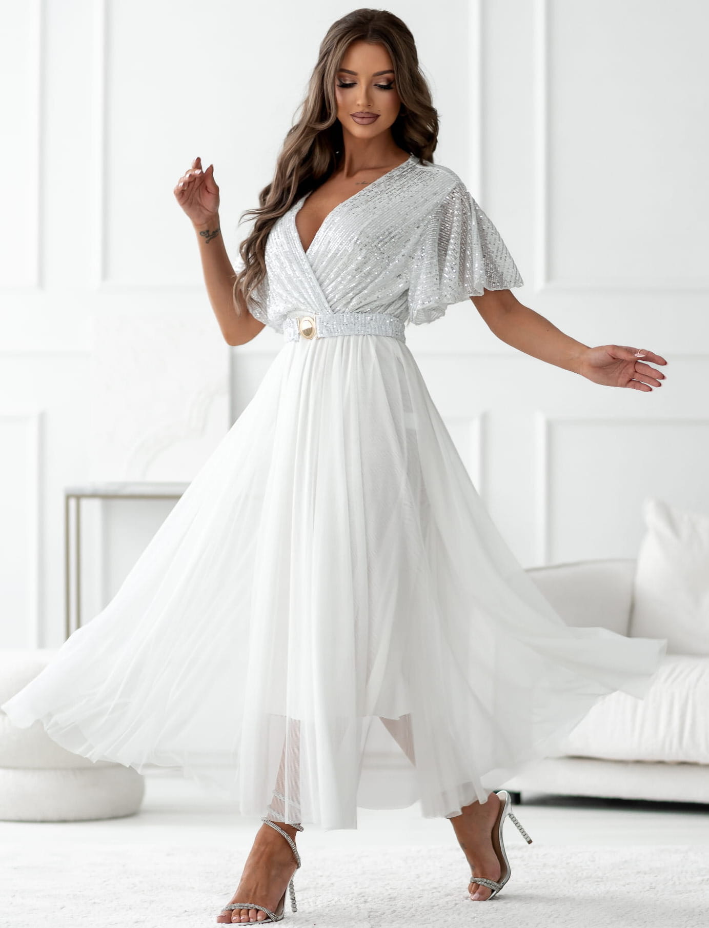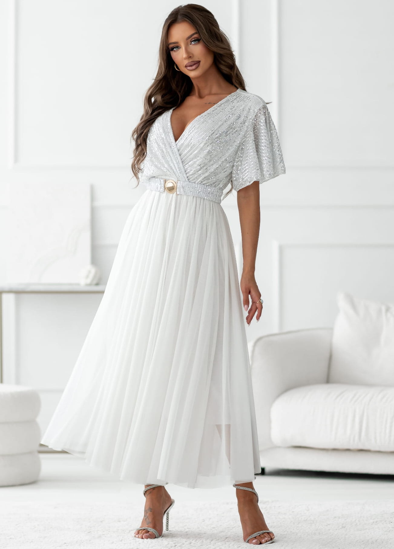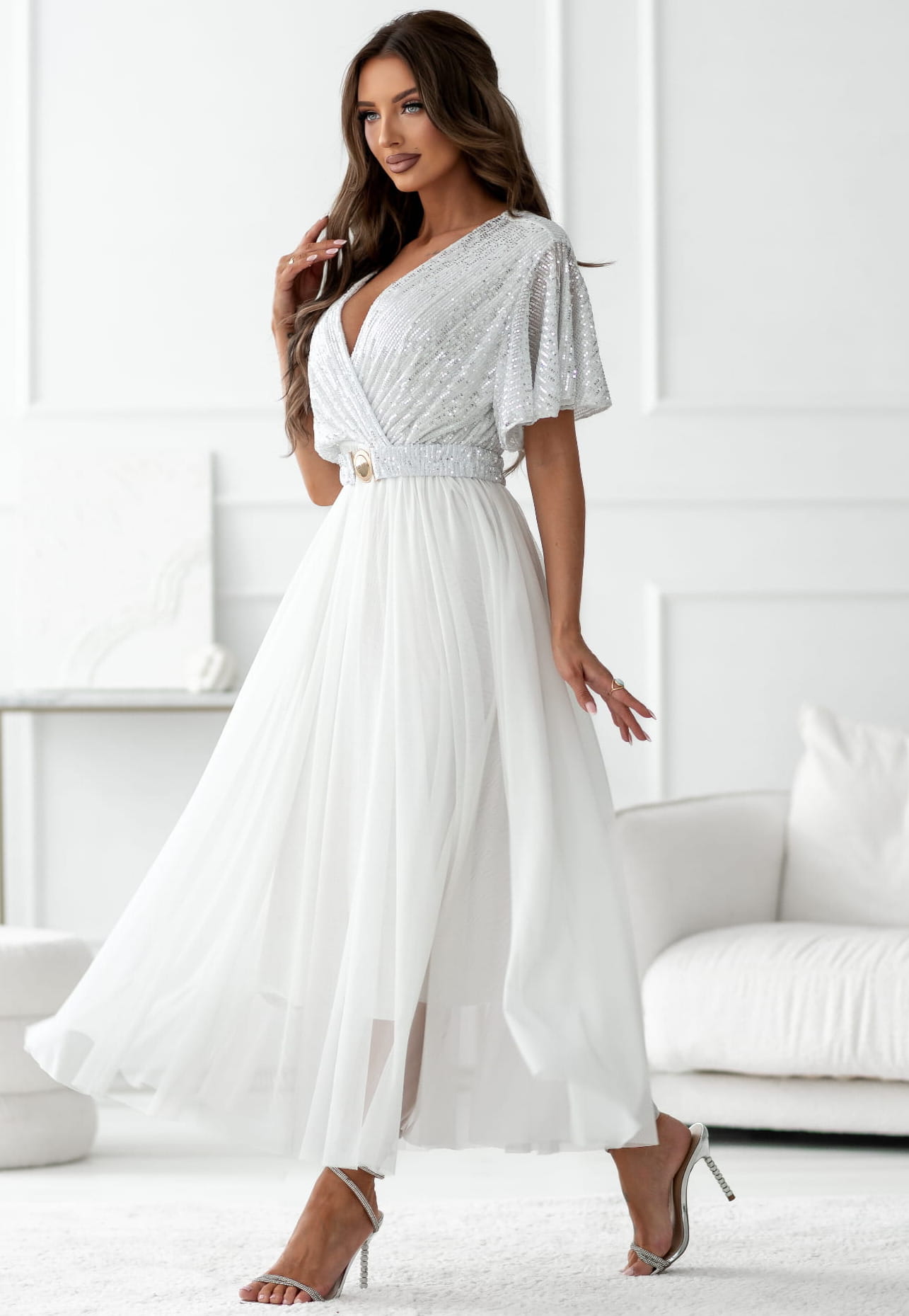 Sukienka kopertowa Maxi biała z cekinami