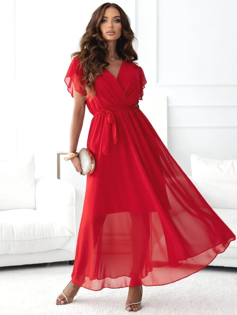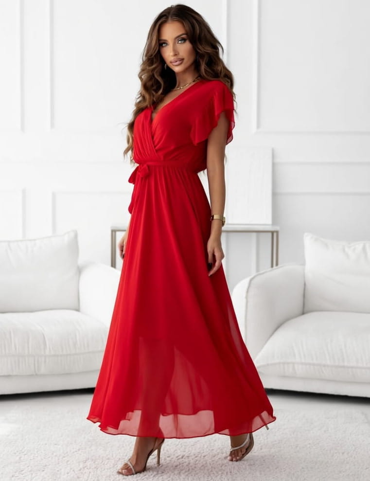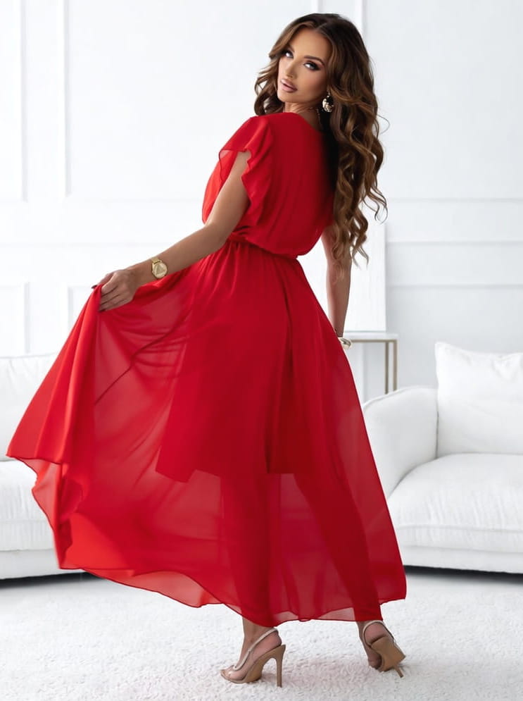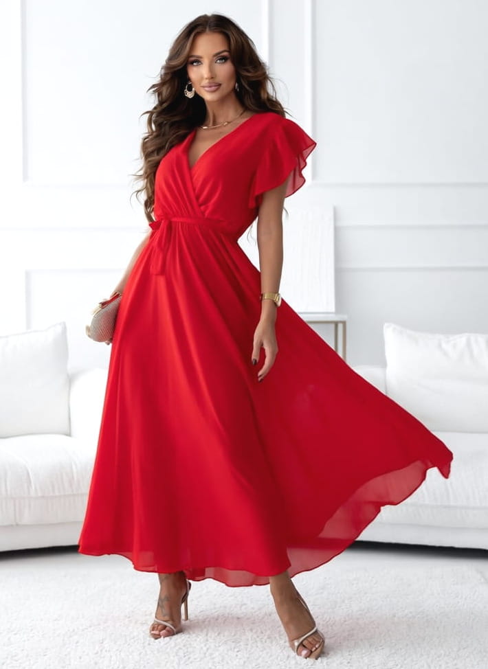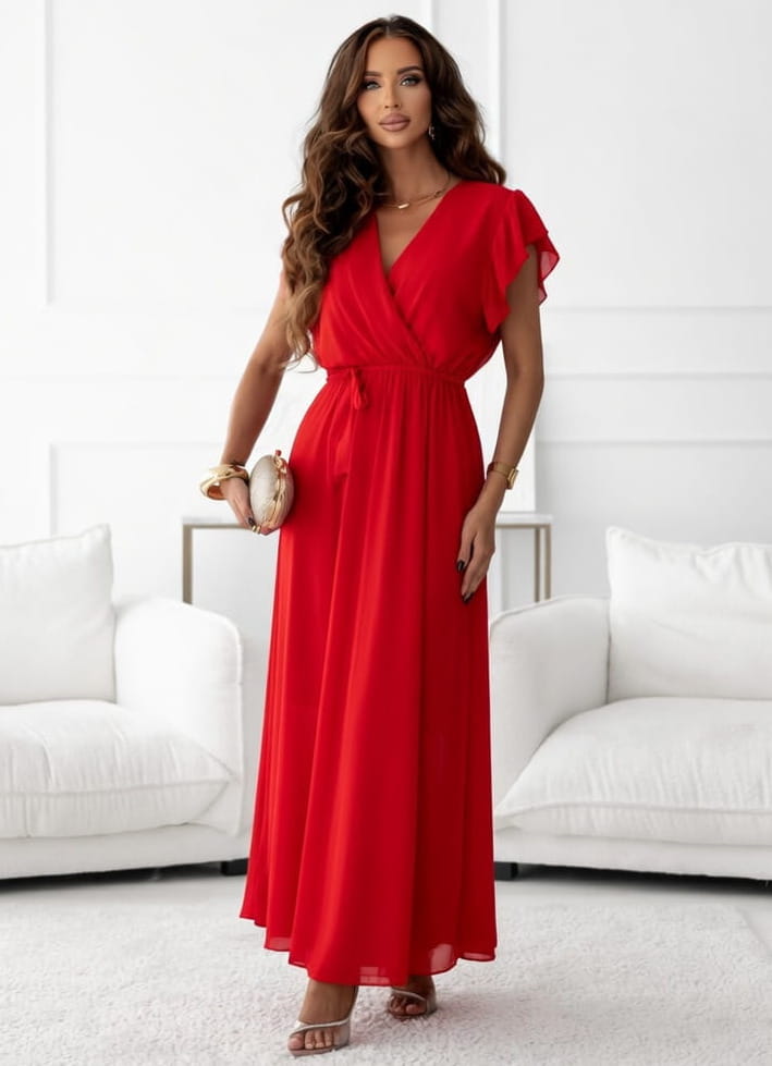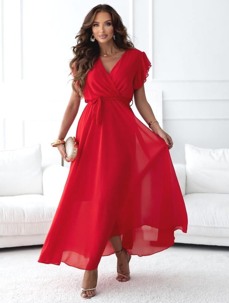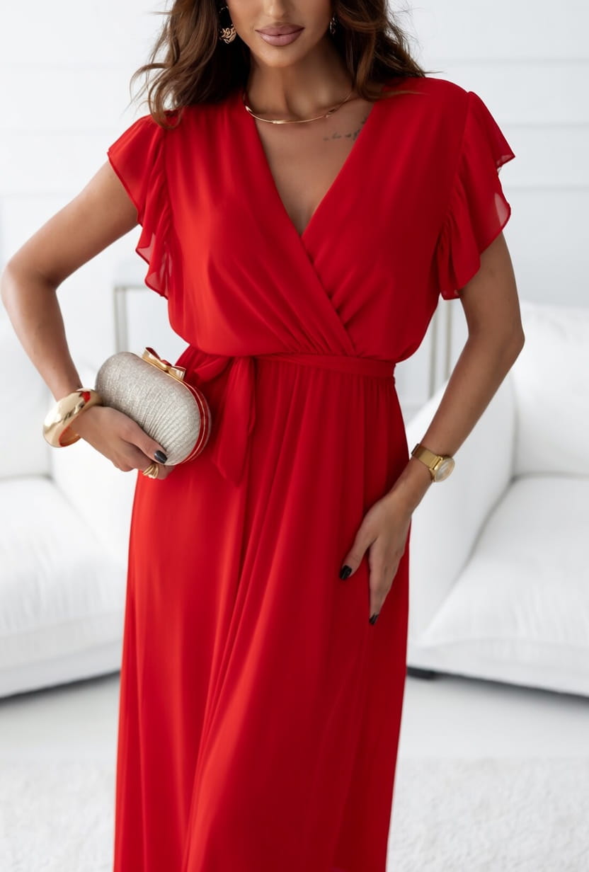 Sukienka kopertowa Piórka Maxi Prosta Gładka Czerwona