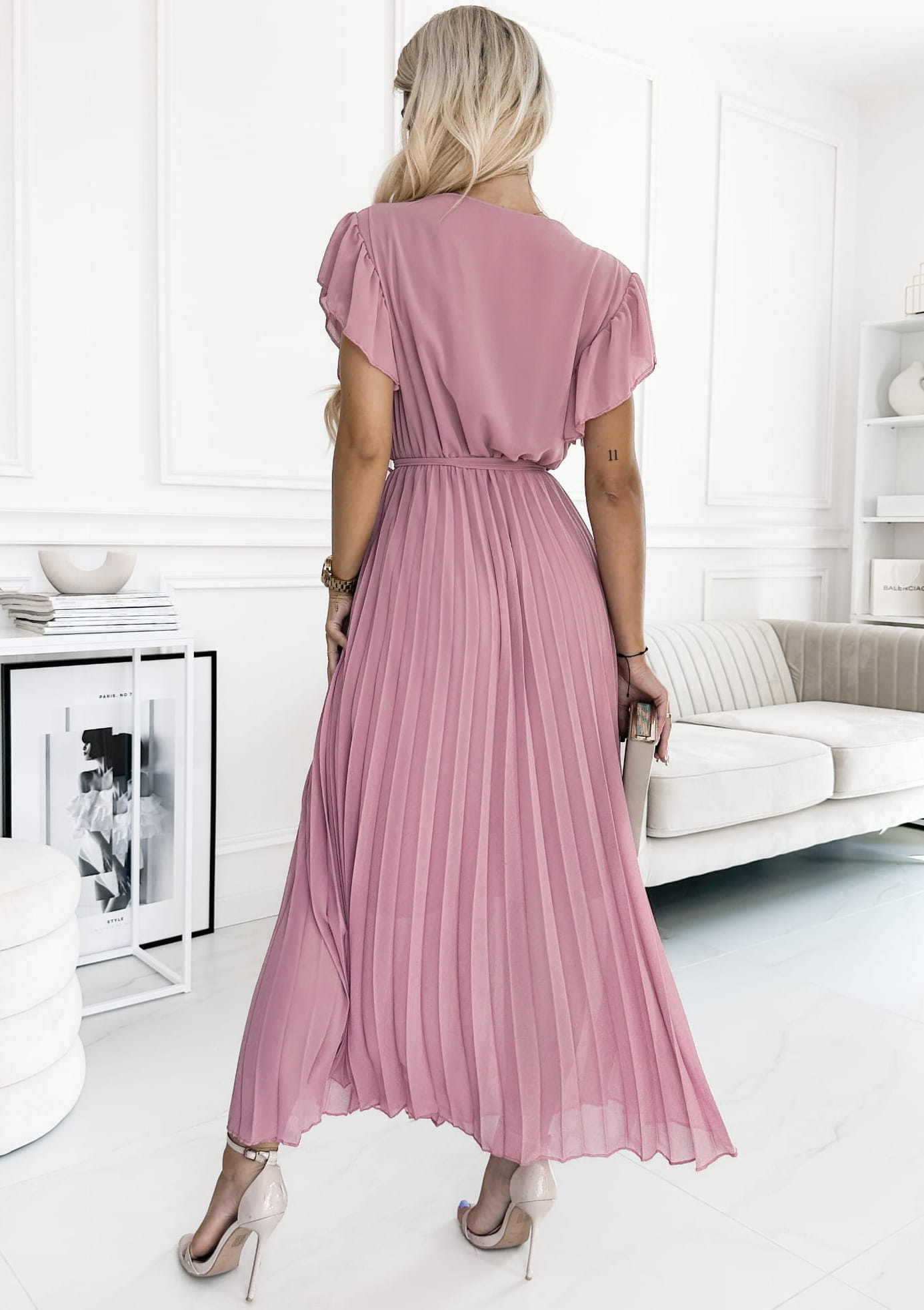 Sukienka kopertowa Piórka Plisa Maxi Gładka pudrowy róż